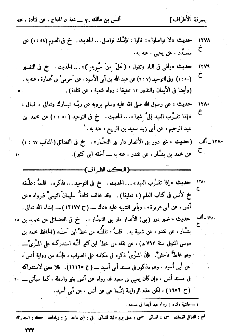 1280 - (ألف خ) (حديث خير دور بني الأنصار دار بني النجَّار (خ) في الفضائل (المناقب 67: 1) عن محمد بن بشَّار عن غندر عنه به. ألحقه ابن كثير) .