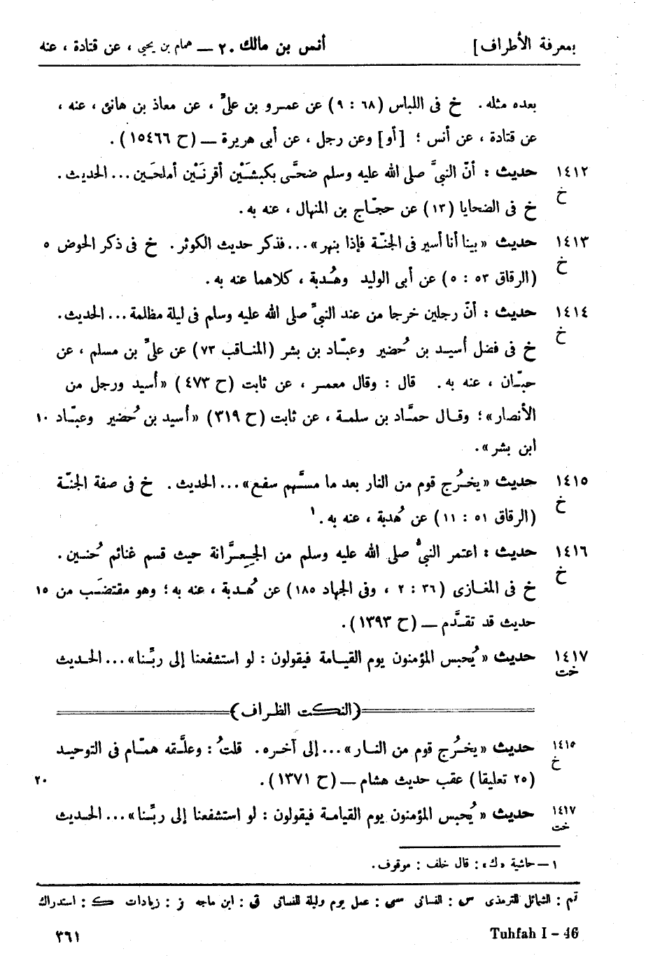 1416 -[خ] حديث اعتمر النبيُّ صَلَّى اللَّهُ عَلَيْهِ وَسَلَّمَ من الجِعِرَّانة حيث قسم غنائم حُنين (خ) في المغازي (36: 2، وفي الجهاد 185) عن هُدبة عنه به. وهو مقتضَب من حديث قد تقدَّم (ح 1393)