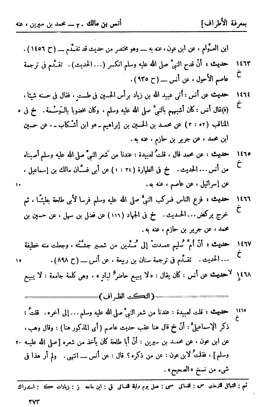 1464 -[خ] حديث عن أنس أُتي عبيد الله بن زياد برأس الحسين في طستٍ فقال في حسنه شيئاً (ف) قال أنس كان أشبههم بالنبيّ صَلَّى اللَّهُ عَلَيْهِ وَسَلَّمَ وكان مخضوباً بالوَسْمة (خ) في المناقب (52: 3) عن محمد بن الحسين بن إبراهيم هو ابن إشكاب عن حسين بن محمد عن جرير بن حازم عنه به.