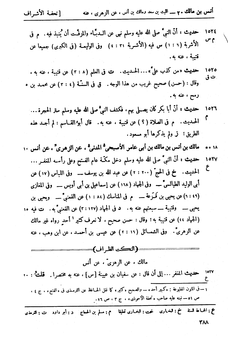 ت فيه (الجهاد 44) عن قتيبة به، وقال: حسن صحيح، لا نعرف كثير 1 أحدٍ رواه غير مالك عن الزهريِّ وفي الشمائل (16: 2) عن عيسى بن أحمد عن ابن وهب عنه -[389]- بتمامه وأعاد فيه حديث قتيبة (16: 1)