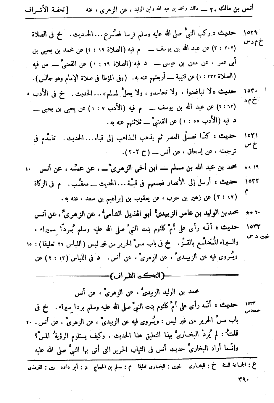 1533 -[خت د س] حديث: أنّه رأى على أُمِّ كلثوم بنت النبيِّ صَلَّى اللَّهُ عَلَيْهِ وَسَلَّمَ بُرداً سِيراء والسيراء المُضِلَّع بالقزِّ. (خ) في باب مسِّ الحرير من غير لبس (اللباس 26 تعليقاً) ويُروى فيه عن الزبيديِّ، عن الزهريِّ، عن أنس.