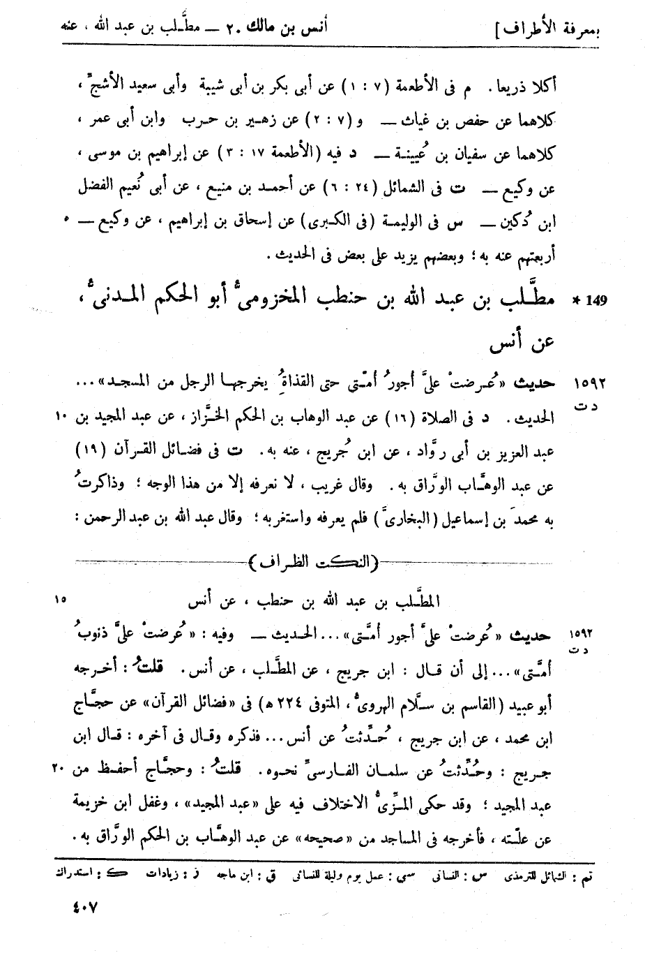 ت في فضائل القرآن (19) عن عبد الوهَّاب الورَّاق به، وقال غريب، لا نعرفه إلا من هذا الوجه، وذاكرتُ به محمدَ بن إسماعيل (البخاريَّ) فلم يعرفه واستغربه، وقال عبد الله بن عبد الرحمن: -[408]- أنكر عليُّ بن المدينيِّ أن يكون المطَّلب سمع من أنس. ز تابعه أيوب بن محمد الوزَّان، عن عبد المجيد، وخالفهما محمد بن يزيد الآدميُّ، فرواه عن عبد المجيد، عن ابن جريج، عن الزهريِّ، عن أنس.