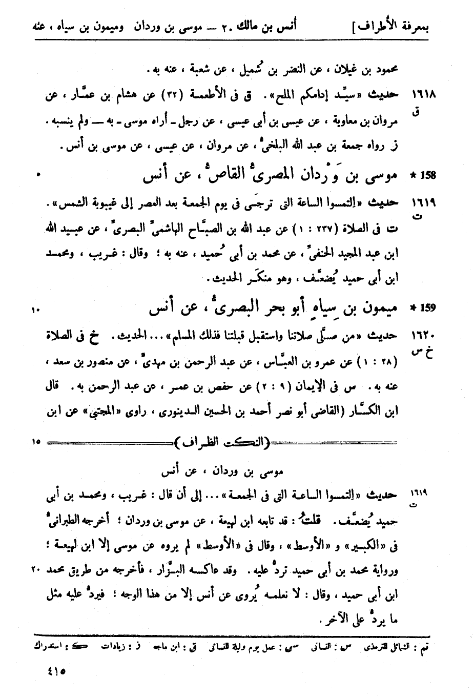 1618 -[ق] حديث سيِّد إدامكم الملح. (ق) في الأطعمة (32) عن هشام بن عمَّار، عن مروان بن معاوية، عن عيسى بن أبي عيسى، عن رجل - أُراه موسى - به - ولم ينسبه. ز رواه جمعة بن عبد الله البلخيُّ، عن مروان، عن عيسى، عن موسى بن أنس.