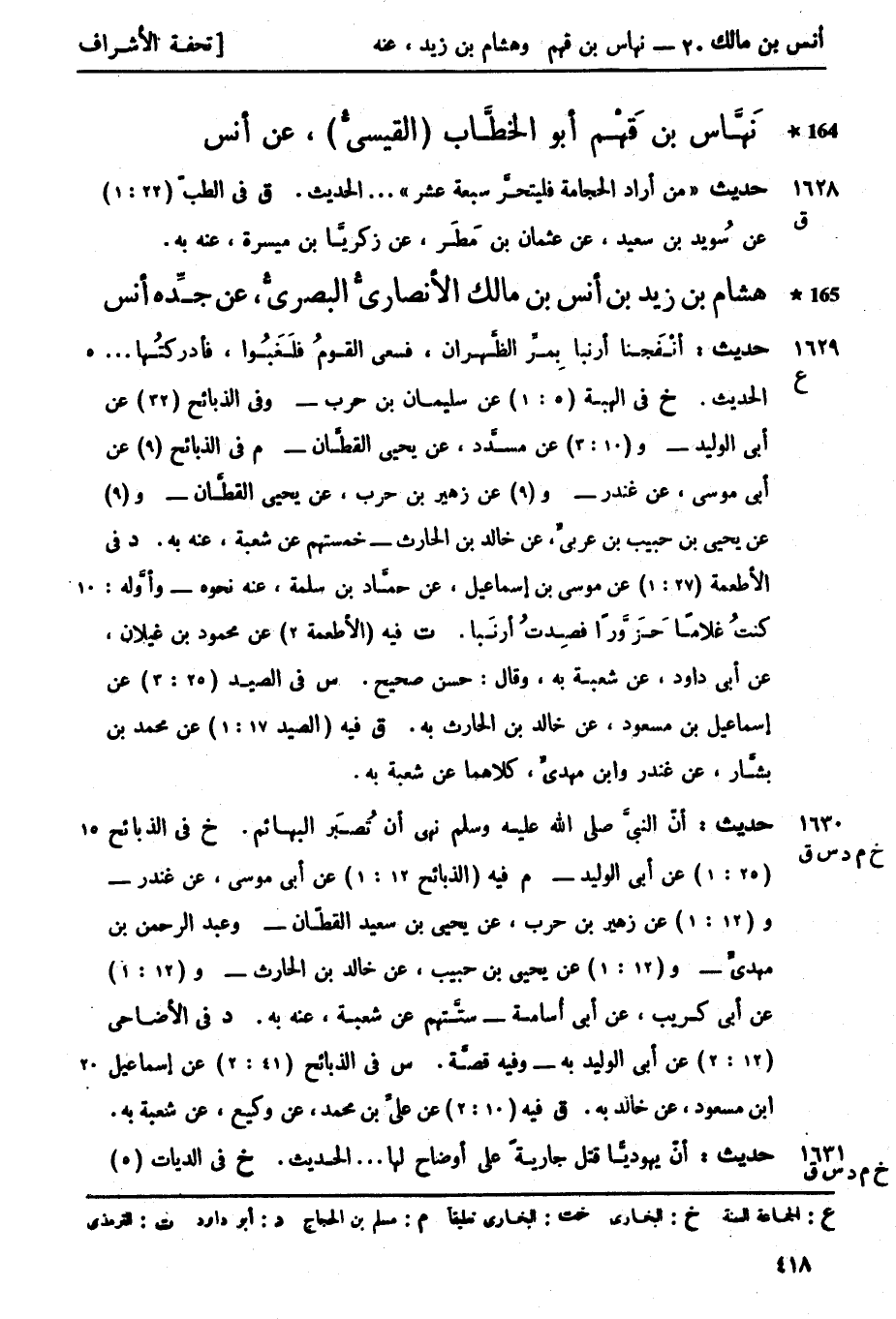 1630 -[خ م د س ق] حديث أنّ النبيَّ صَلَّى اللَّهُ عَلَيْهِ وَسَلَّمَ نهى أن تُصبَر البهائم (خ) في الذبائح (25: 1) عن أبي الوليد