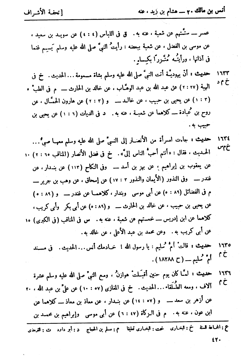 م في الفضائل (89: 5) عن أبي موسى وبندار كلاهما عن غندر و (89: 5) عن يحيى بن حبيب عن خالد بن الحارث و (89: 5) عن أبي بكر وأبي كريب كلاهما عن ابن إدريس خمستهم عن شعبة، عنه به. س في المناقب (في الكبرى) عن أبي كريب به وعن محمد بن عبد الأعلى عن خالد به.