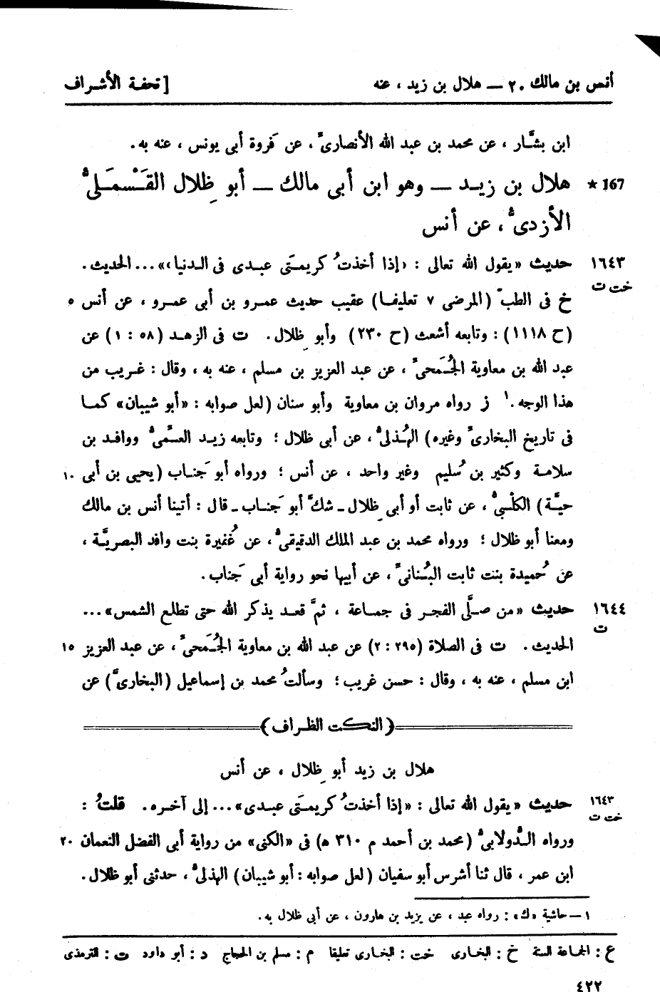 1644 -[ت] حديث من صلَّى الفجر في جماعة ثمَّ قعد يذكر الله حتى تطلع الشمس.... الحديث ت في الصلاة (295: 2) عن عبد الله بن معاوية الجُمِحِيّ عن عبد العزيز بن مسلم عنه به. وقال حسن غريب وسألتُ محمد بن إسماعيل (البخاريَّ) عن -[423]- أبي ظِلال فقال هو مقارب الحديث واسمه هلال 1