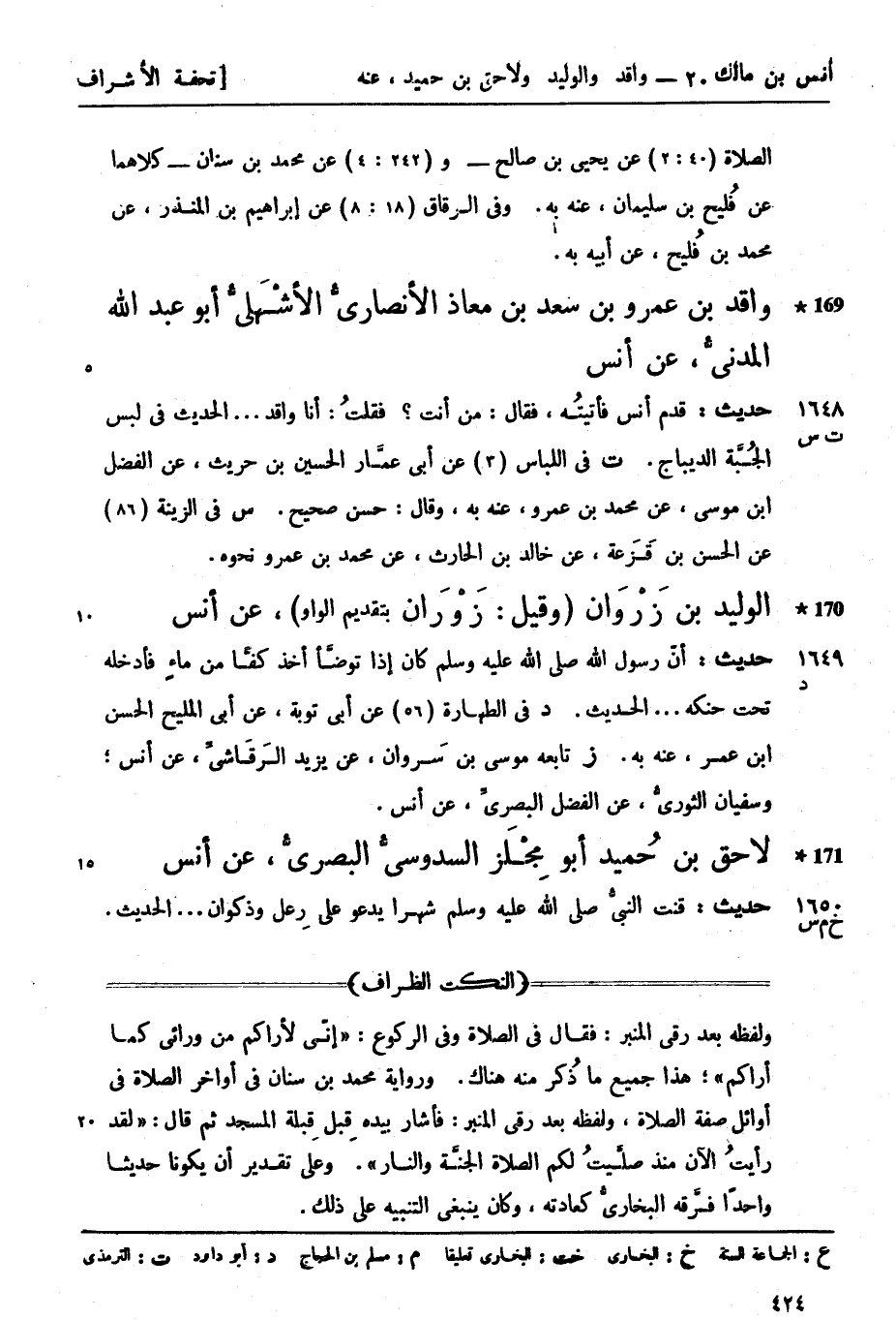 1648 -[ت س] حديث قدم أنس فأتيتُه فقال: من أنت؟ فقلتُ: أنا واقد.... الحديث في لبس الجُبَّة الديباج. ت في اللباس (3) عن أبي عمَّار الحسين بن حريث عن الفضل بن موسى عن محمد بن عمرو، عنه به، وقال: حسن صحيح. س في الزينة (86) عن الحسن بن قَزَعة، عن خالد بن الحارث، عن محمد بن عمرو نحوه.