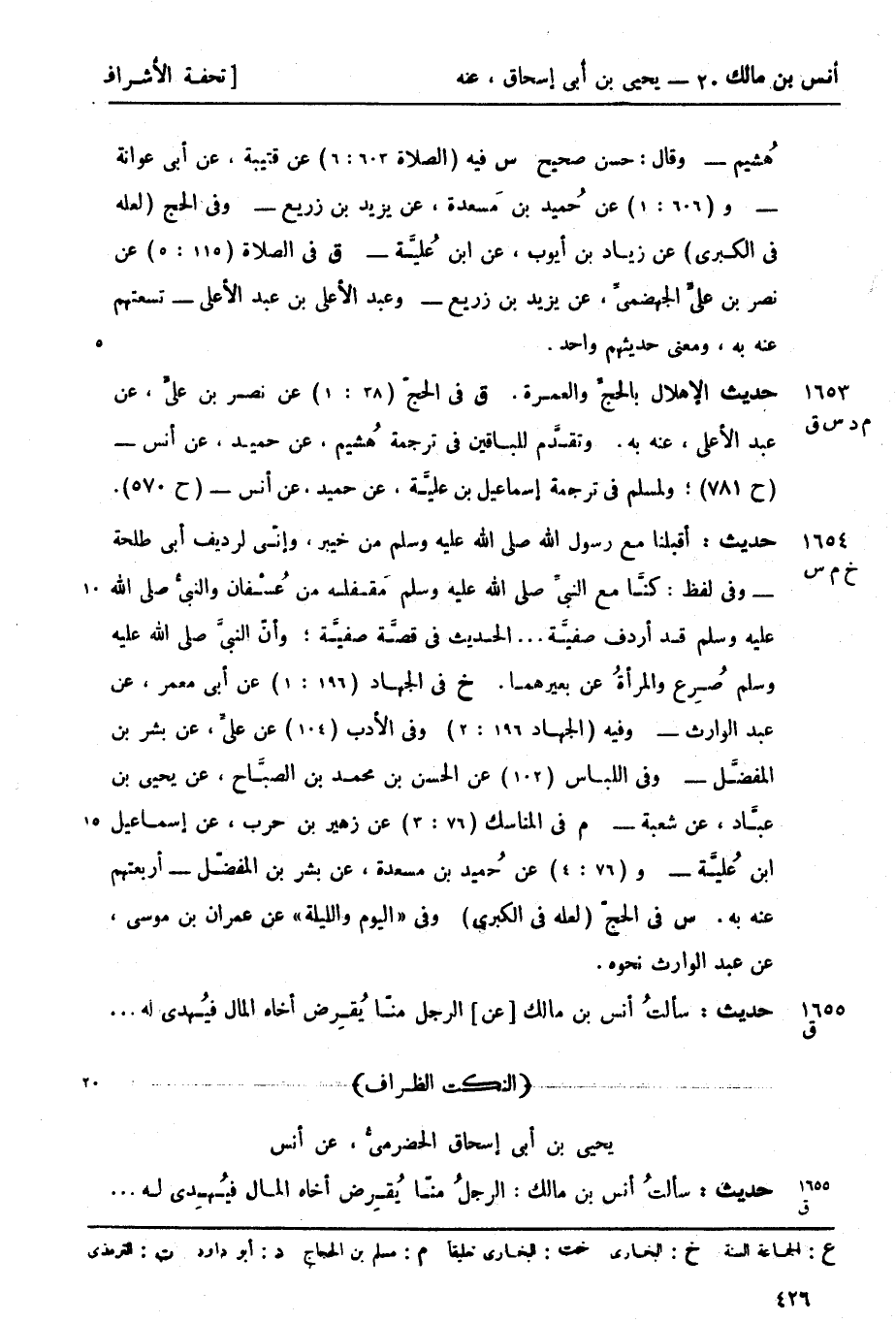 1654 -[خ م س] حديث أقبلنا مع رسول الله صَلَّى اللَّهُ عَلَيْهِ وَسَلَّمَ من خيبر، وإنّي لرديف أبي طلحة - وفي لفظ: كنَّا مع النبيِّ صَلَّى اللَّهُ عَلَيْهِ وَسَلَّمَ مَقفله من عُسْفان والنبيُّ صَلَّى اللَّهُ عَلَيْهِ وَسَلَّمَ قد أردف صفيَّة.... الحديث في قصَّة صفيَّة، وأنّ النبيَّ صَلَّى اللَّهُ عَلَيْهِ وَسَلَّمَ صُرِع والمرأةُ عن بعيرهما. خ في الجهاد (196: 1) عن أبي معمر، عن عبد الوارث - وفيه (الجهاد 196: 2) وفي الأدب (104) عن عليَ، عن بشر بن المفضَّل - وفي اللباس (102) عن الحسن بن محمد بن الصبَّاح، عن يحيى بن عبَّاد، عن شعبة - م في المناسك (76: 3) عن زهير بن حرب، عن إسماعيل ابن عُليَّة - و (76: 4) عن حُميد بن مسعدة، عن بشر بن المفضّل - أربعتهم عنه به س في الحجّ (لعله في الكبرى) وفي اليوم والليلة عن عمران بن موسى، عن عبد الوارث نحوه.