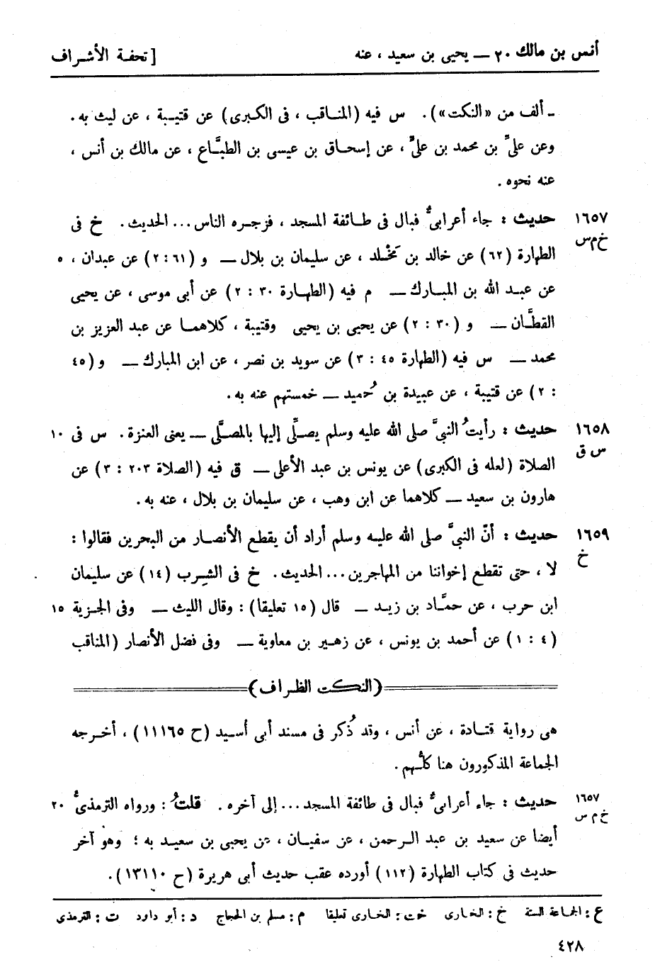 1657 -[خ م س] حديث جاء أعرابيٌّ فبال في طائفة المسجد، فزجره الناس.... الحديث خ في الطهارة (62) عن خالد بن مَخْلد، عن سليمان بن بلال - و (61: 2) عن عبدان عن عبد الله بن المبارك - م فيه (الطهارة 30: 2) عن أبي موسى، عن يحيى القطَّان - و (30: 2) عن يحيى بن يحيى وقتيبة، كلاهما عن عبد العزيز بن محمد - س فيه (الطهارة 45: 3) عن سويد بن نصر، عن ابن المبارك - و (45: 2) عن قتيبة، عن عبيدة بن حُميد - خمستهم عنه به.