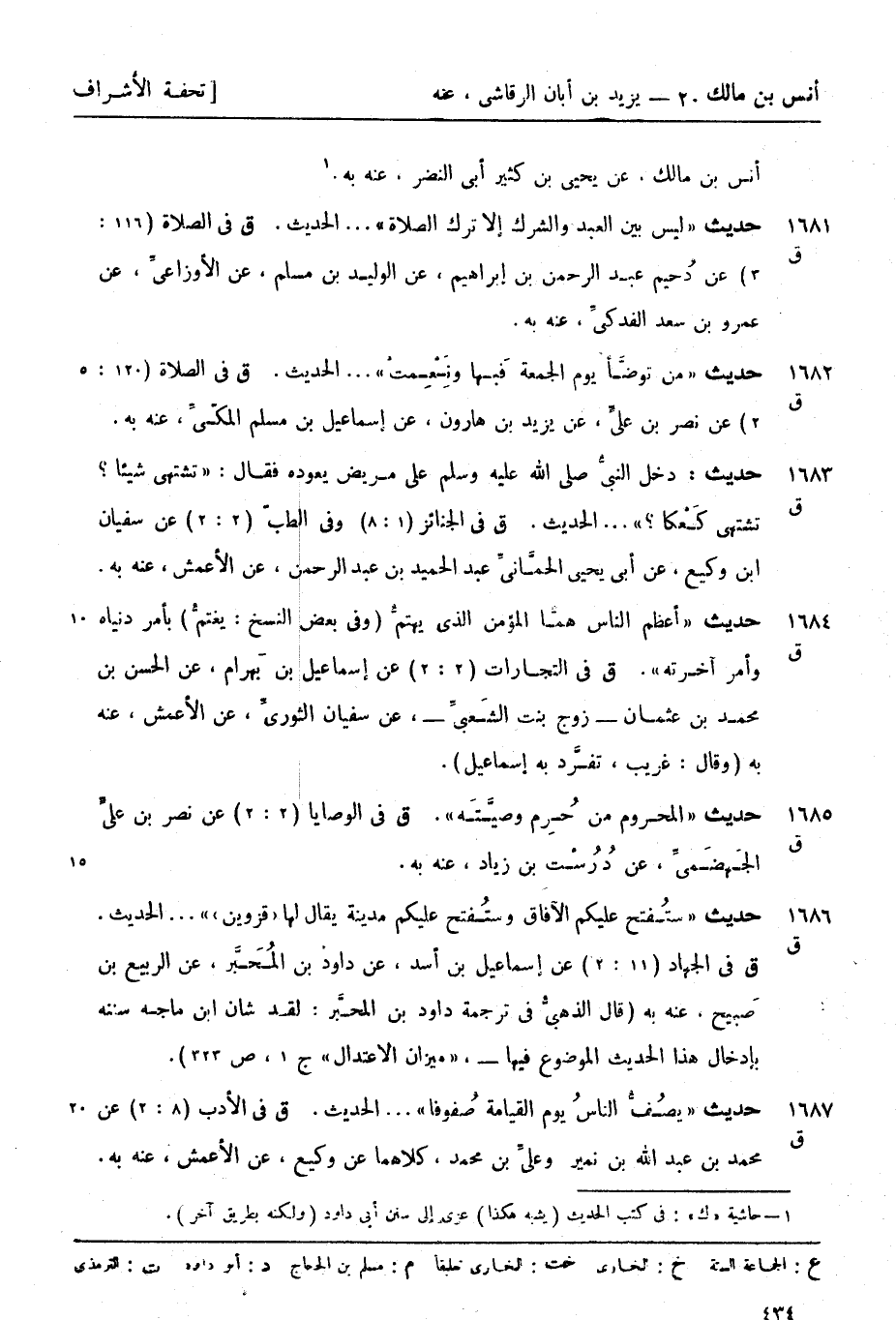 1687 -[ق] حديث يصُفُّ الناسُ يوم القيامة صُفوفاً.... الحديث ق في الأدب (8: 2) عن محمد بن عبد الله بن نمير، وعليِّ بن محمد كلاهما عن وكيع عن الأعمش، عنه به.
