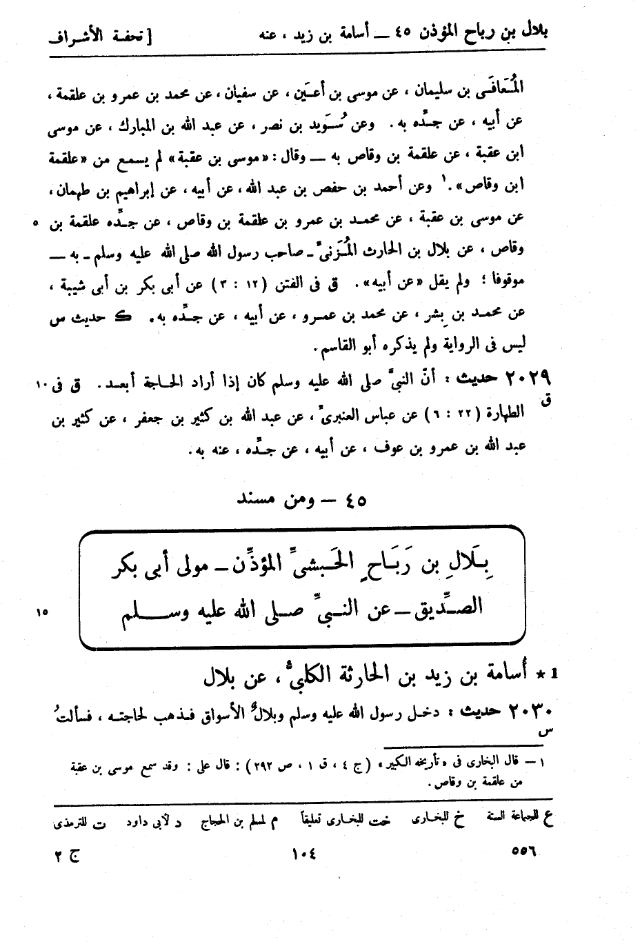 ومن مسند بِلالِ بن رَبَاحٍ الحَبشيِّ المؤذِّن - مولى أبي بكر الصدِّيق - عن النبيِّ صَلَّى اللَّهُ عَلَيْهِ وَسَلَّمَ 1 أُسامة بن زيد بن الحارثة الكلبيُّ، عن بلال