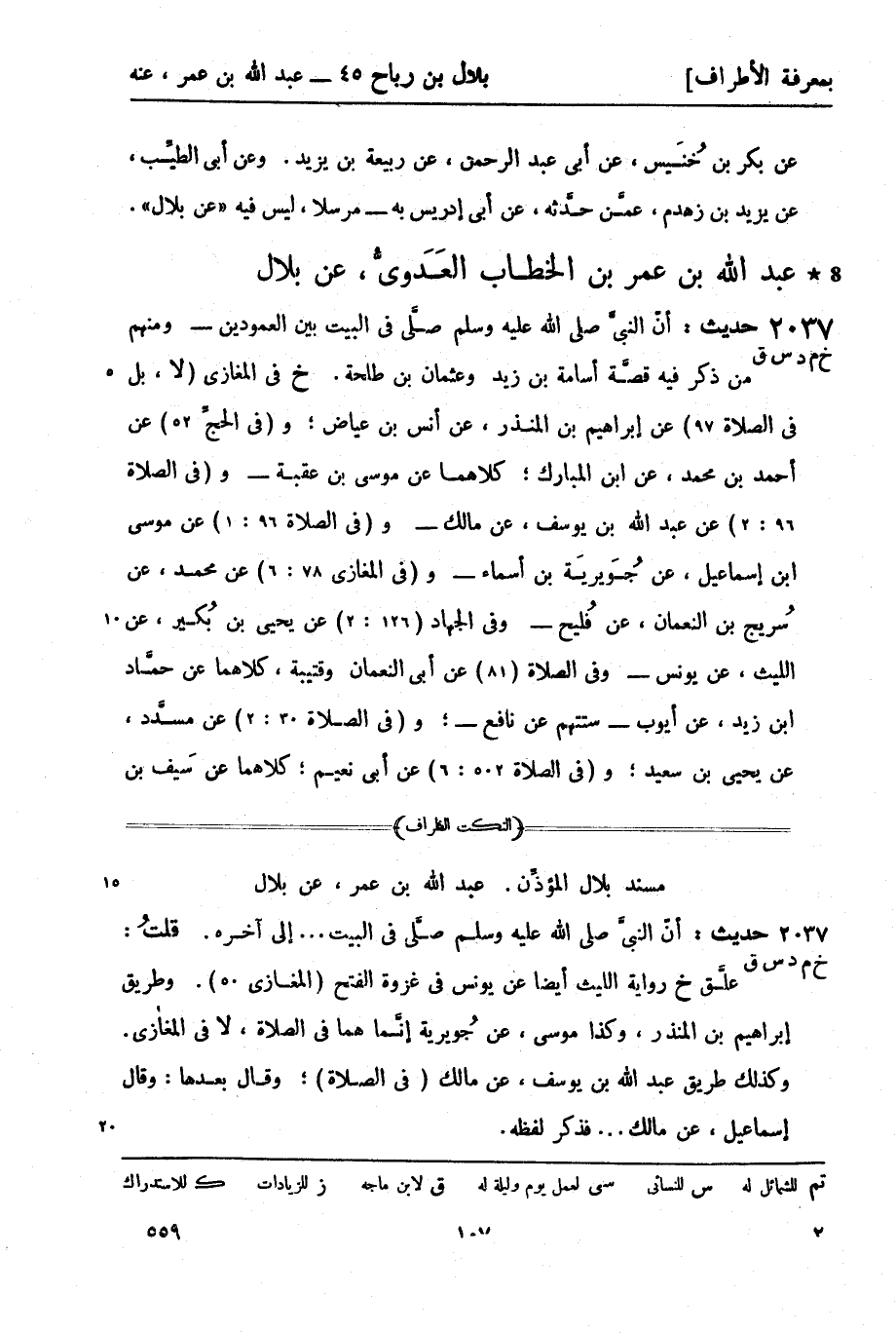 2037 -[خ م د س ق] حديث: أن النبي صَلَّى اللَّهُ عَلَيْهِ وَسَلَّمَ صلى في البيت بين العمودين - ومنهم من ذكر فيه قصة أسامة بن زيد وعثمان بن طلحة.