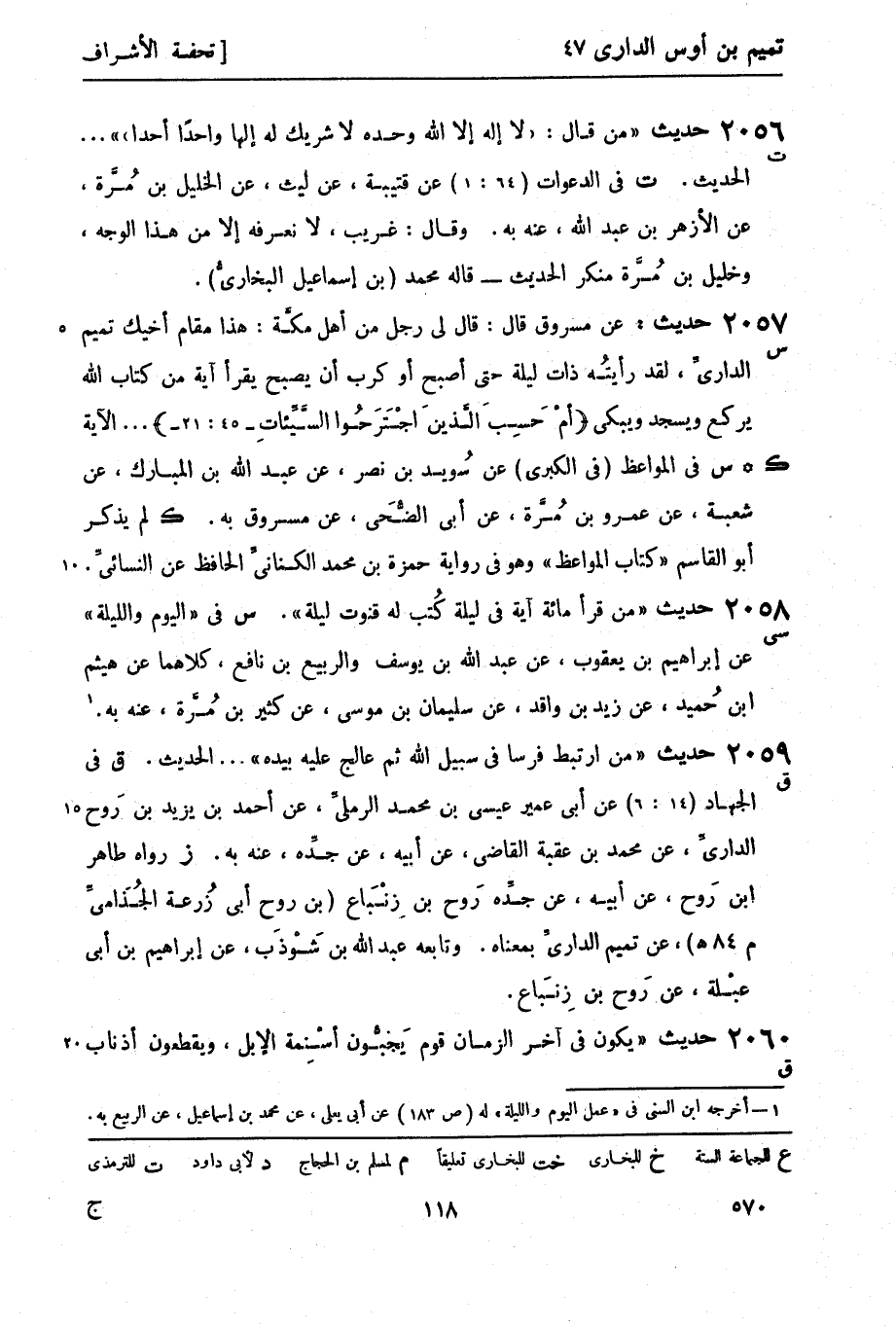 ق في الجهاد (14: 6) عن أبي عمير عيسى بن محمد الرمليِّ، عن أحمد بن يزيد بن رَوح الداريِّ، عن محمد بن عقبة القاضي، عن أبيه، عن جدِّه عنه به. (ز) رواه طاهر بن رَوح، عن أبيه، عن جدِّه روح بن زِنْبَاع (بن روح أبي زُرعة الجُذَاميِّ م 84 هـ) ، عن تميم الداريِّ بمعناه. وتابعه عبد الله بن شَوْذَب، عن إبراهيم بن أبي عبْلة، عن رَوح بن زِنبَاع.