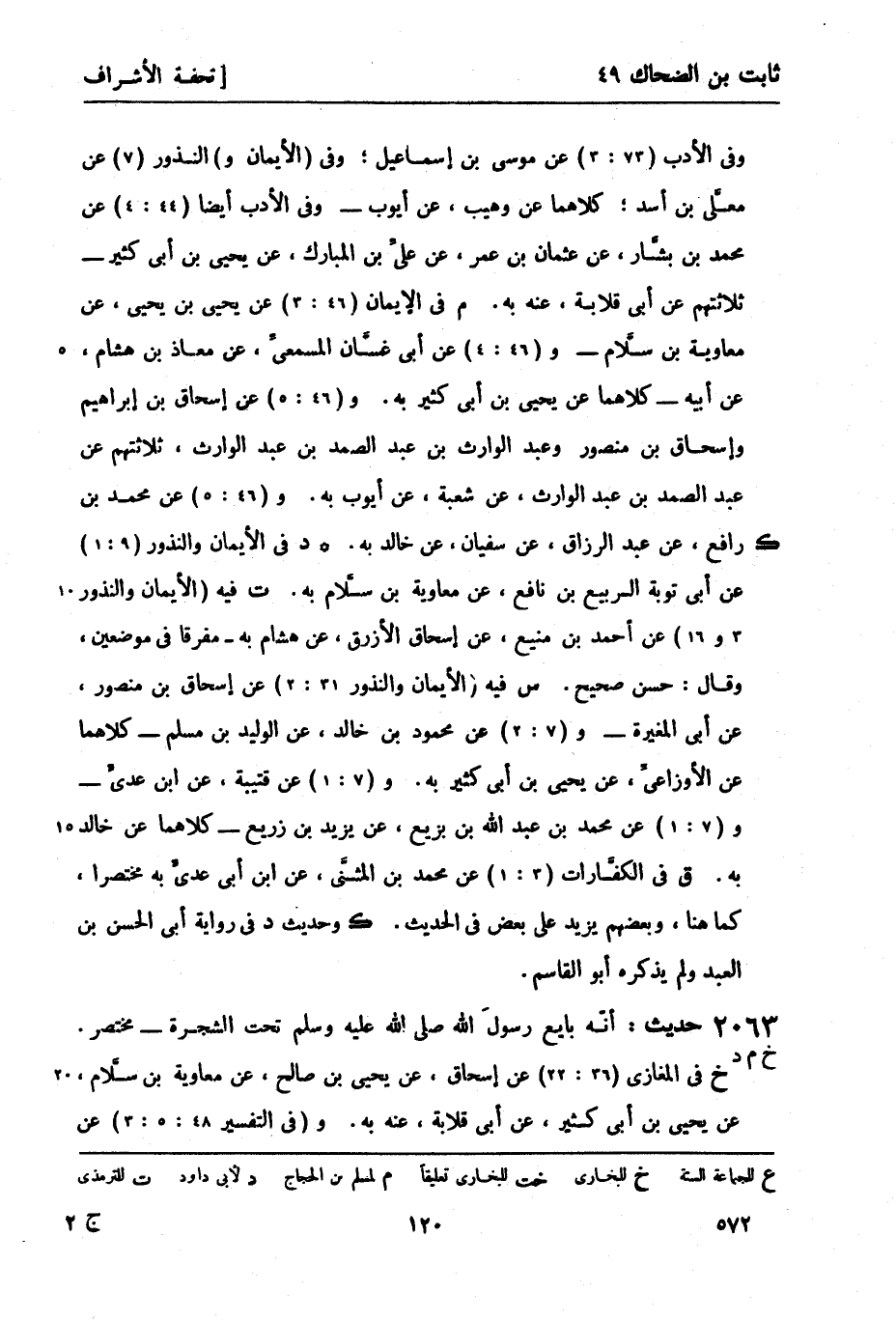خ في المغازي (36: 22) عن إسحاق، عن يحيى بن صالح، عن معاوية بن سلاَّم، عن يحيى بن أبي كثير، عن أبي قلابة، عنه به. و (في التفسير 48: 5: 3) عن -[121]- محمد بن الوليد، عن غندر، عن شعبة، عن خالد، عن أبي قلابة، عن ثابت بن الضحَّاك - وكان من أصحاب الشجرة.