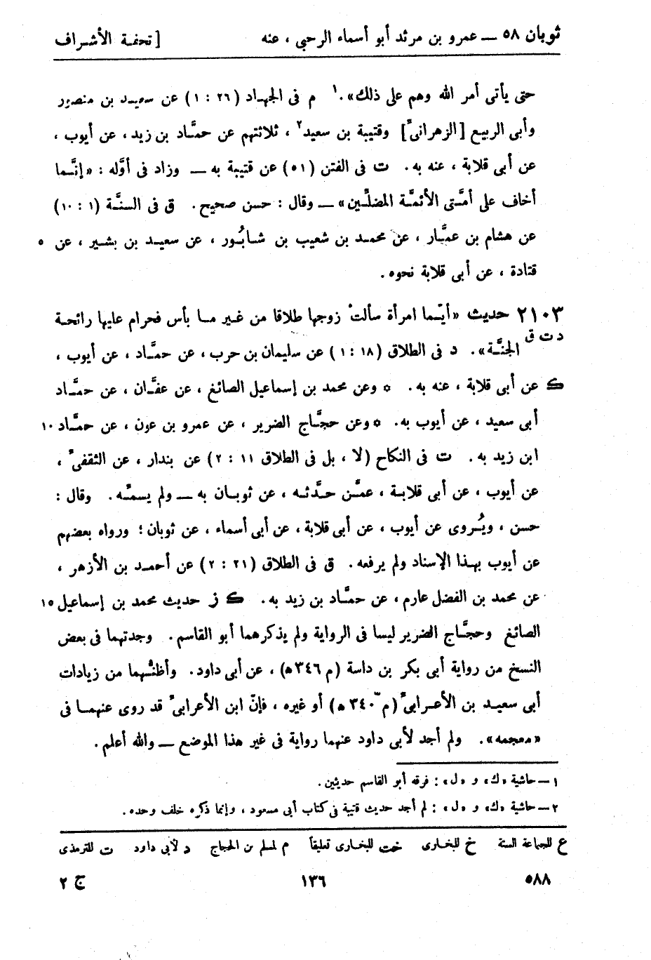 ق في الطلاق (21: 2) عن أحمد بن الأزهر، عن محمد بن الفضل عارم، عن حمَّاد بن زيد به. (ك) (ز) حديث محمد بن إسماعيل الصائغ وحجَّاج الضرير ليسا في الرواية ولم يذكرهما أبو القاسم. وجدتهما في بعض النسخ من رواية أبي بكر بن داسة (م 346 هـ) ، عن أبي داود، وأظنُّهما من زيادات أبي سعيد بن الأعرابيِّ (م 303هـ) أو غيره، فإنّ ابن الأعرابي قد روى عنهما في معجمه. ولم أجد لأبي داود عنهما رواية في غير هذا الموضع - والله أعلم.