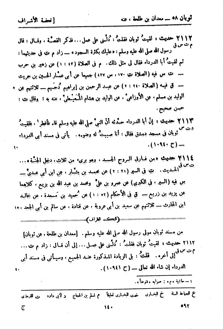 2112 -[م ت س ق] حديث: لقيتُ ثوبان فقلتُ: دُلَّني على عمل ... فذكر القصَّة، وقال: قال رسول الله صَلَّى اللَّهُ عَلَيْهِ وَسَلَّمَ: عليك بكثرة السجود - زاد (م ت) في حديثهما: ثم لقيتُ أبا الدرداء فقال لي مثل ذلك.