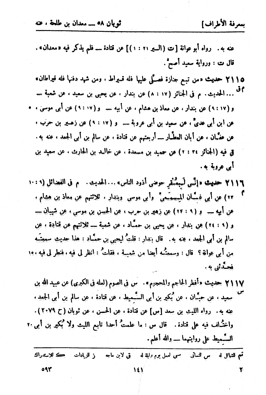 م في الفضائل (9: 23) عن أبي غسَّان المِسمَعيِّ وأبي موسى وبندار، ثلاثتهم عن معاذ بن هشام، عن أبيه - و (9: 23) عن زهير بن حرب، عن الحسن بن موسى، عن شيبان - و (9: 24) عن بندار، عن يحيى بن حمَّاد، عن شعبة - ثلاثتهم عن قتادة، عن سالم بن أبي الجعد، عنه به. قال بندار: قلتُ ليحيى بن حمَّاد: هذا حديث سَمِعْتَهُ من أبي عوانة؟ قال: وسمعته أيضاً من شعبة، فقلتُ: انظر لي فيه، فنظر لي فيه فحدَّثني به.
