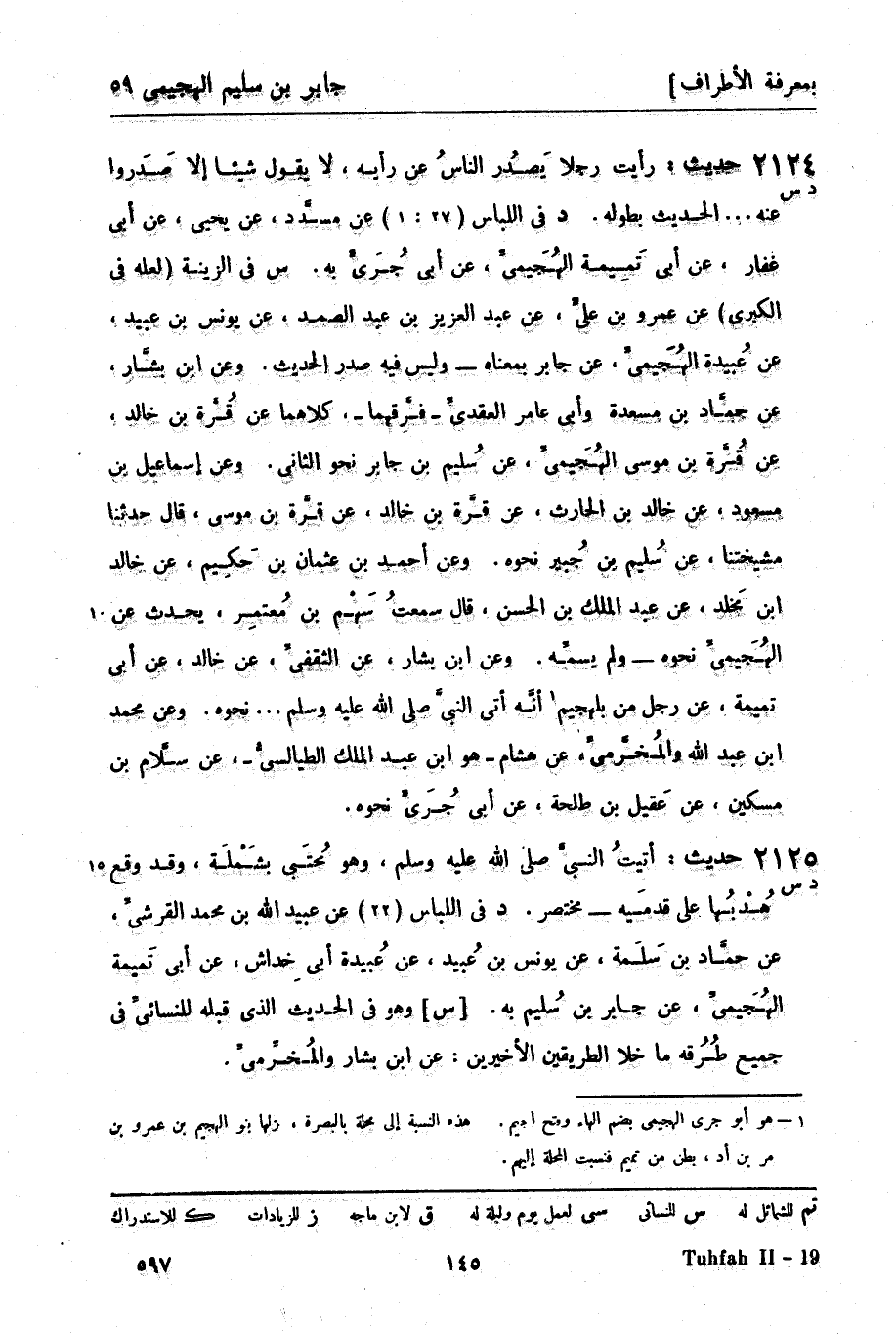 س في الزينة (لعله في الكبرى) عن عمرو بن عليَ، عن عبد العزيز بن عن عبد الصمد، عن يونس بن عبيد، عن عُبيدة الهُجَيميِّ، عن جابر بمعناه - وليس فيه صدر الحديث. وعن ابن بشَّار، عن حمَّاد بن مسعدة وأبي عامر العقديِّ - فرَّقهما - كلاهما عن قُرَّة بن خالد، عن قُرَّة بن موسى الهُجَيميِّ، عن سُليم بن جابر نحو الثاني. وعن إسماعيل بن مسعود، عن خالد بن الحارث، عن قرَّة بن خالد، عن قرَّة بن موسى، قال حدثنا مشيختنا، عن سُليم بن جُبير نحوه. وعن أحمد بن عثمان بن حَكِيم، عن خالد بن مَخلد، عن عبد الملك بن الحسن، قال سمعتُ سَهْم بن مُعتمِر، يحدث عن الهُجَيميِّ نحوه - ولم يسمِّه. وعن ابن بشار، عن الثقفيِّ، عن خالد، عن أبي تميمة، عن رجل من بلهجيم 1 أنَّه أتى النبيّ صَلَّى اللَّهُ عَلَيْهِ وَسَلَّمَ ... نحوه. وعن محمد بن عبد الله المخرمي، عن هشام - هو ابن عبد الملك الطيالسيُّ -، عن سلاَّم بن مسكين، عن عَقيل بن طلحة، عن أبي جُرَيَ نحوه.