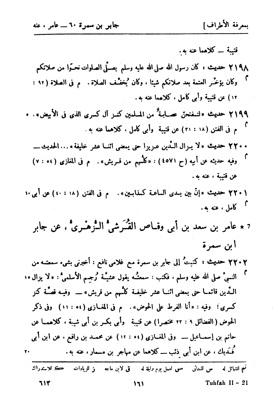 2202 - حديث: كتبتُ إلى جابر بن سمرة مع غلامي نافع: أخبرني بشيء سمعته من النبيّ صَلَّى اللَّهُ عَلَيْهِ وَسَلَّمَ، فكتب: سمعتُه يقول عشيَّة رُجِمَ الأسلميُّ: لا يزال الدِّين قائماً حتى يمضي اثنا عشر خليفة كلُّهم من قريش - وفيه قصَّة كنز كسرى، وفيه: أنا الفرط على الحوض.