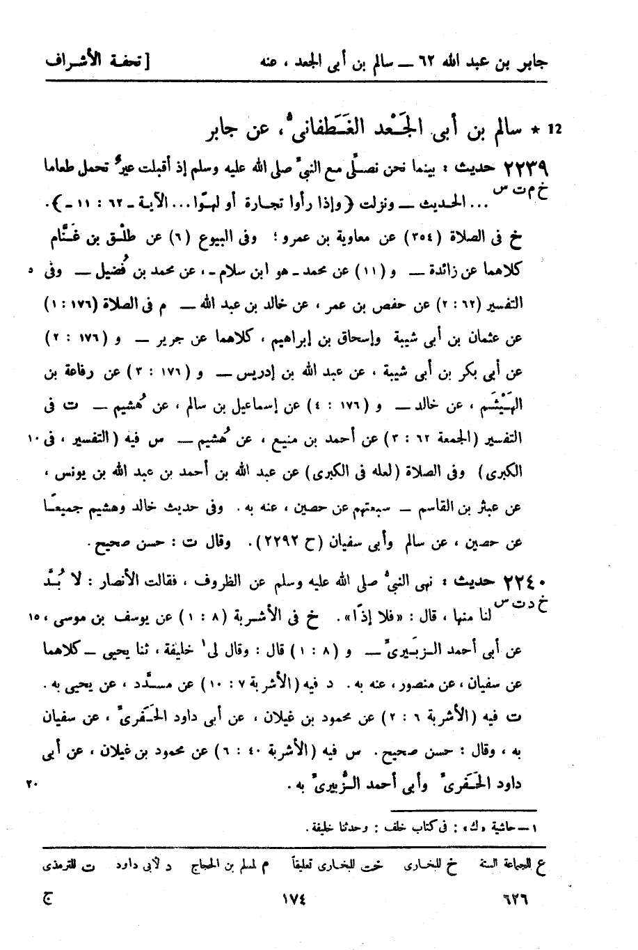 2239 -[خ م ت س] حديث: بينما نحن نصلِّي مع النبيِّ صَلَّى اللَّهُ عَلَيْهِ وَسَلَّمَ إذا أقبلت عيرٌ تحمل طعاماً ... الحديث - ونزلت وإذا رأوا تجارة أو لهواً ... (الآية - 62: 11 -)