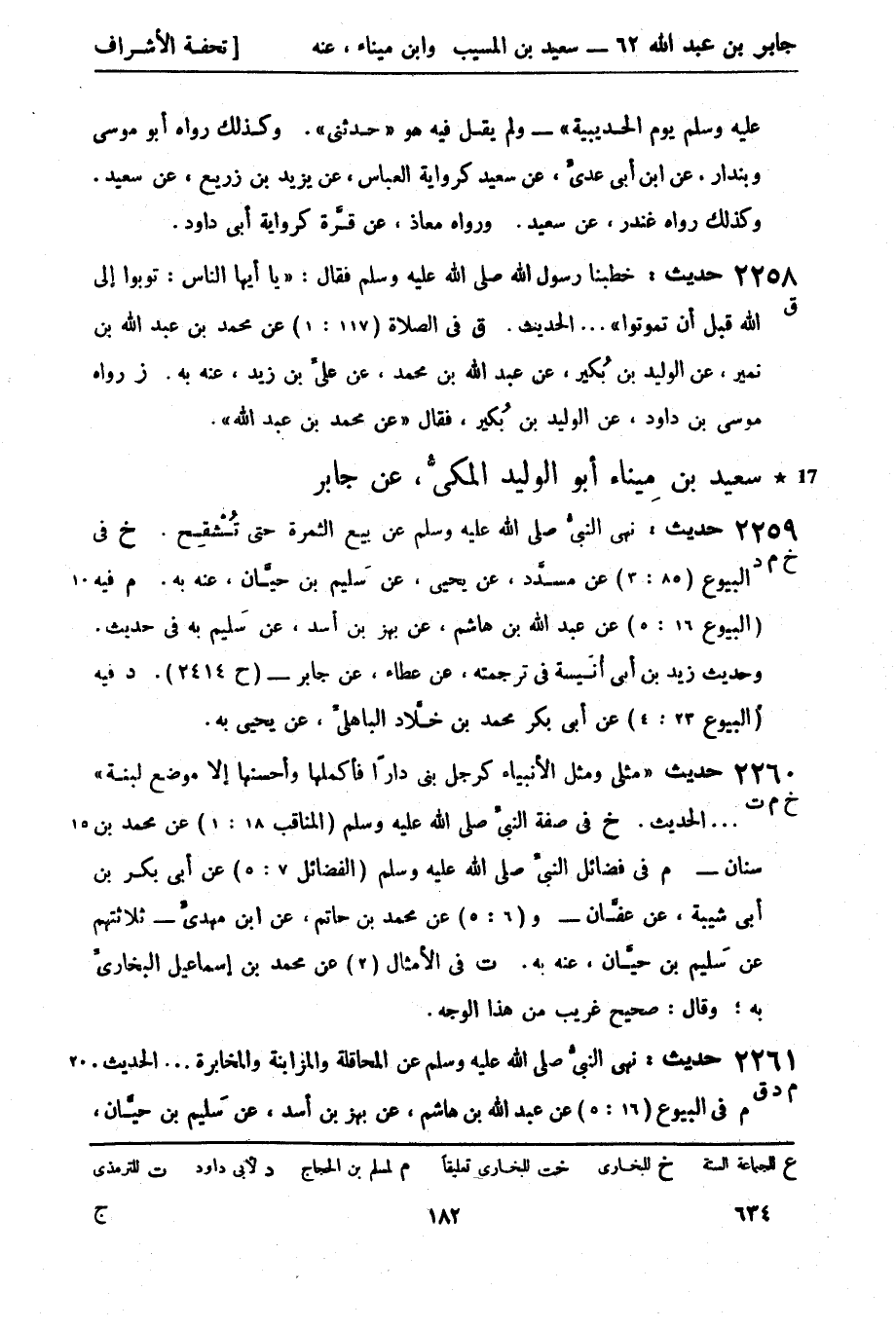 م في البيوع (16: 5) عن عبد الله بن هاشم، عن بهز بن أسد، عن سَليم بن حيَّان -[183]- عنه به. وذكر فيه الإشقاح وفسَّره. و (16: 6) عن عبيد الله بن عمر القواريريِّ ومحمد بن عبيد بن حساب، كلاهما عن حمَّاد بن زيد، عن أيوب، عن سعيد بن ميناء وأبي الزبير (ح2666) ، كلاهما عن جابر به - وزاد: و [نهى] عن بيع الثُّنيا ورخَّص في العرايا. وحديث زيد بن أبي أُنَيسة يأتي في ترجمته، عن عطاء، عن جابر - (ح2414) .