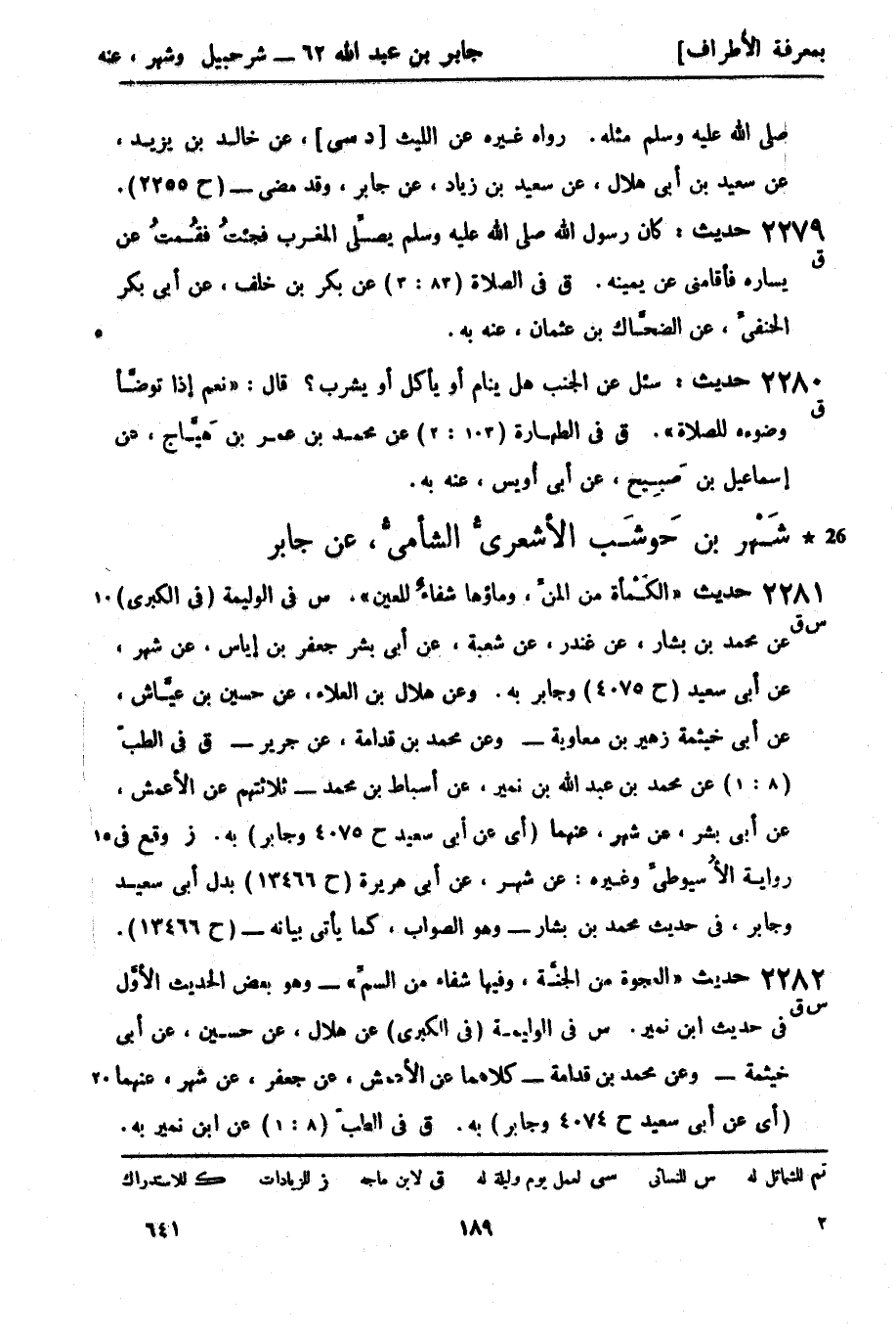 س في الوليمة (في الكبرى) ، عن محمد بن بشار، عن غندر، عن شعبة، عن أبي بشر جعفر بن إياس، عن شهر، عن أبي سعيد (ح4075) وجابر به. وعن هلال بن العلاء، عن حسين بن عيَّاش، عن أبي خيثمة زهير بن معاوية - وعن محمد بن قدامة، عن جرير - (ق) في الطبّ (8: 1) عن محمد بن عبد الله بن نمير، عن أسباط بن محمد - ثلاثتهم عن الأعمش، عن أبي بشر، عنهما عن شهر، (أي عن أبي سعيد ح4075 وجابر) به. (ز) وقع في رواية الأُسيوطيِّ وغيره: عن شهر، عن أبي هريرة (ح13466) بدل أبي سعيد وجابر، في حديث محمد بن بشار - وهو الصواب، كما يأتي بيانه - (ح13466) .