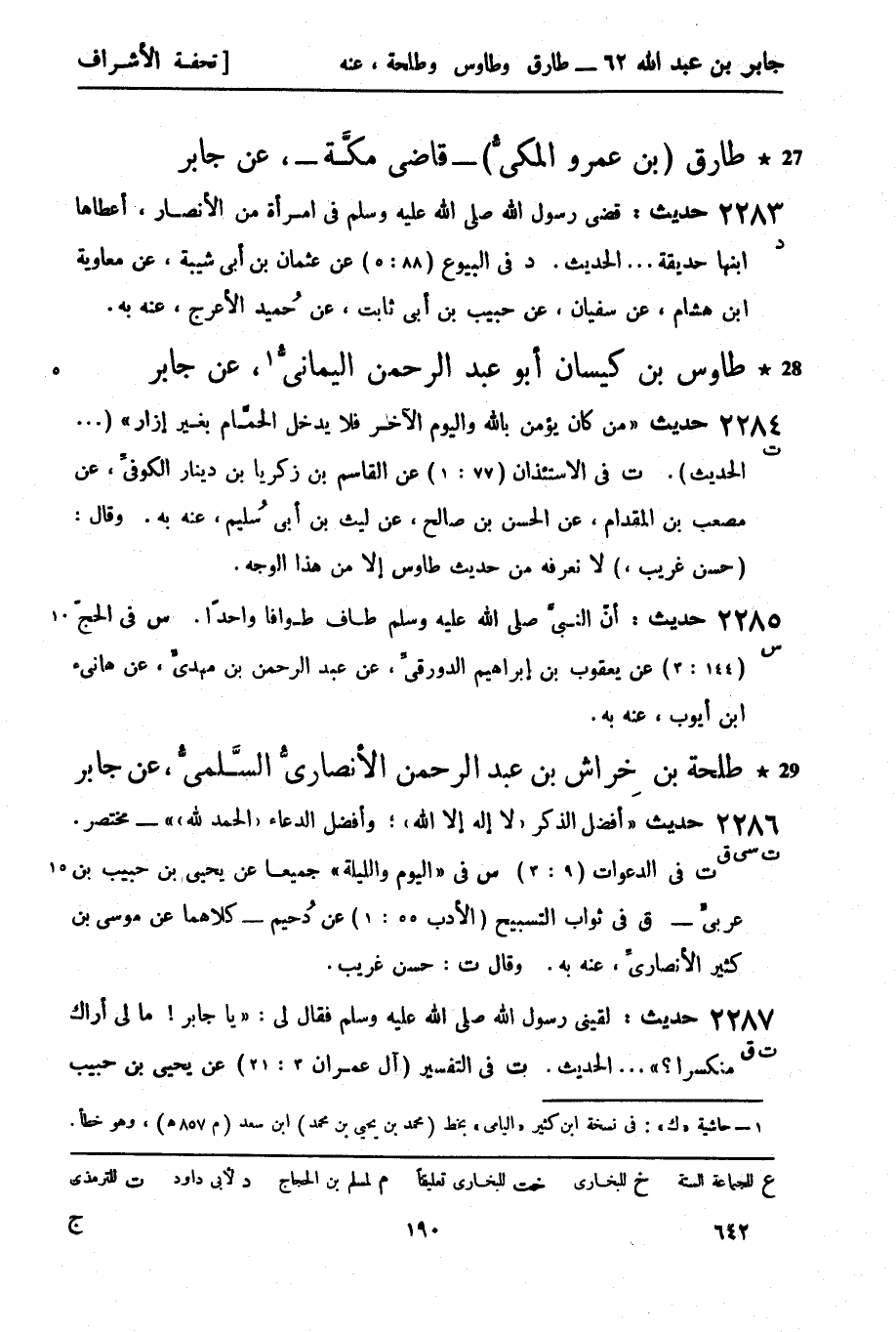 ت في الاستئذان (77: 1) عن القاسم بن زكريا بن دينار الكوفيِّ، عن مصعب بن المقدام، عن الحسن بن صالح، عن ليث بن أبي سُليم عنه به. وقال: (حسن غريب) لا نعرفه من حديث طاوس إلا من هذا الوجه.