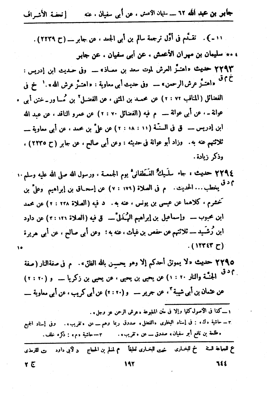 2293 -[خ م ق] حديث اهتز العرش لموت سعد بن معاذ - وفي حديث ابن إدريس: اهتزَّ عرش الرحمن - وفي حديث أبي معاوية: اهتزَّ عرش الله 1. (خ) في الفضائل (المناقب 72: 2) عن محمد بن المثنى، عن الفضل 2 بن مُساور - ختن أبي عوانة -، عن أبي عوانة -