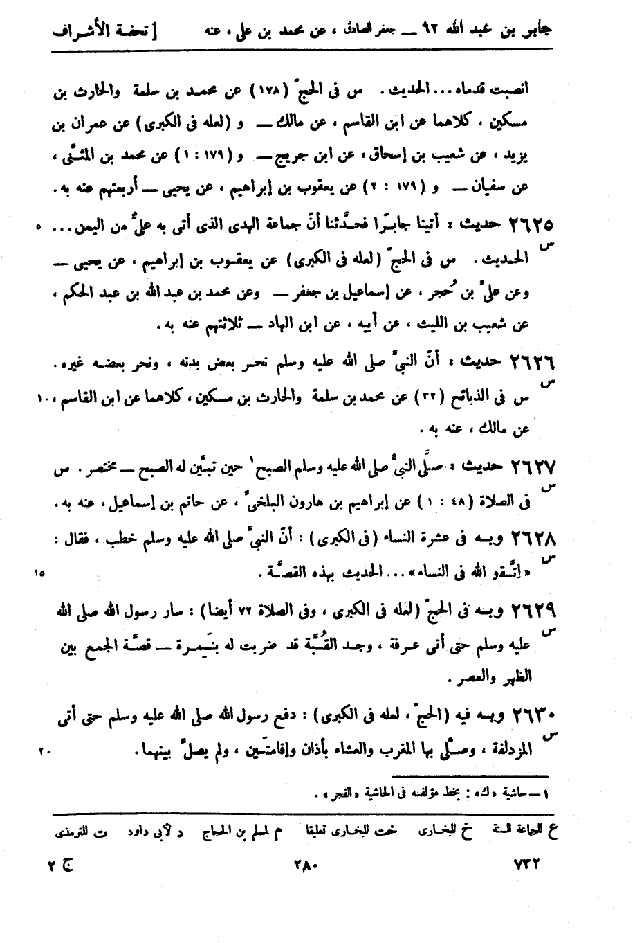 2629 - وبه في الحجّ (لعله في الكبرى، وفي الصلاة 72 أيضاً) : سار رسول الله صَلَّى اللَّهُ عَلَيْهِ وَسَلَّمَ حتى أتى عرفة، وجد القُبَّة قد ضربت له بتمرة - قصَّة الجمع بين الظهر والعصر.