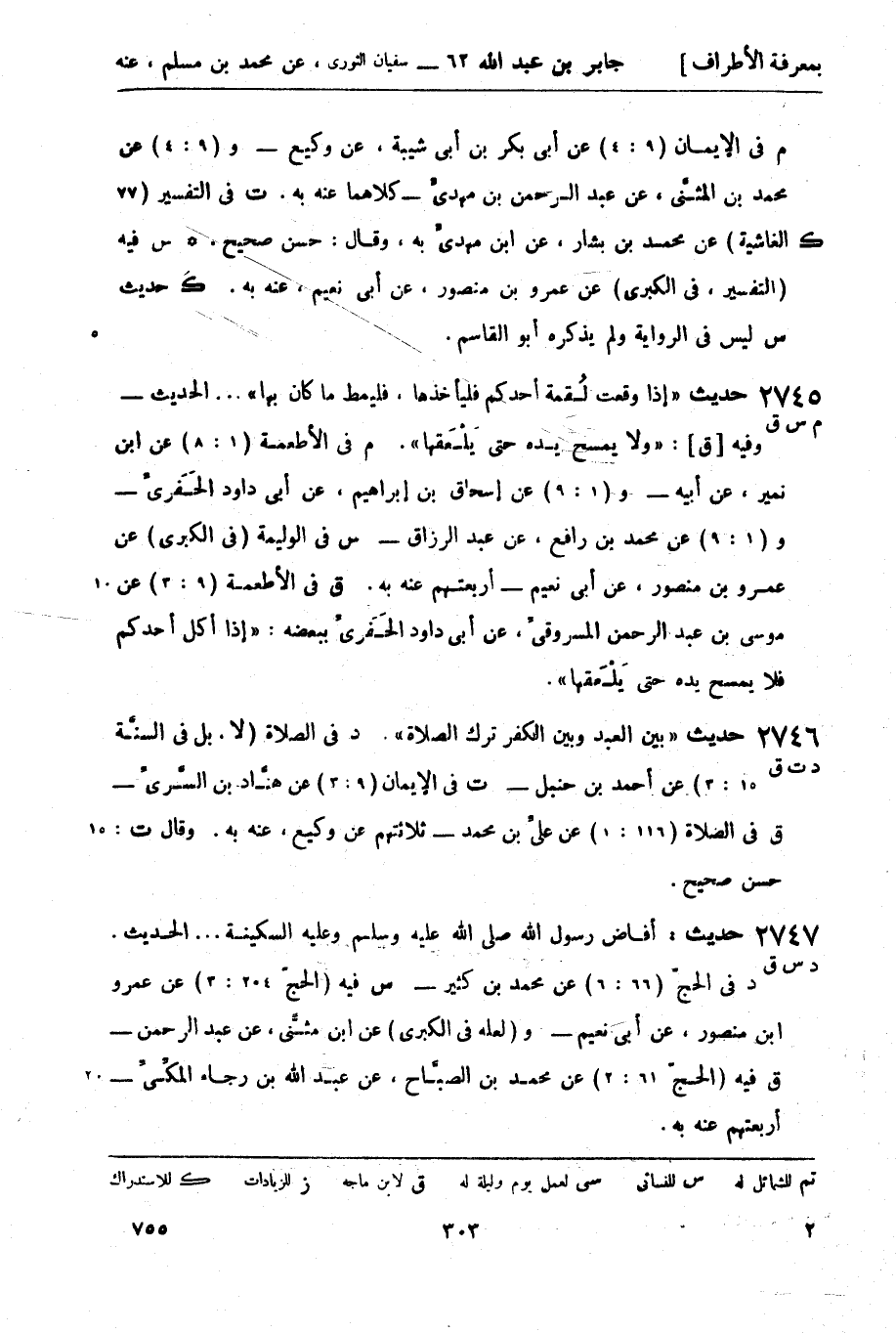م في الأطعمة (1: 8) عن ابن نمير، عن أبيه - و (1: 9) عن إسحاق بن إبراهيم، عن أبي داود الحَفَريِّ - و (1: 9) عن محمد بن رافع، عن عبد الرزاق -