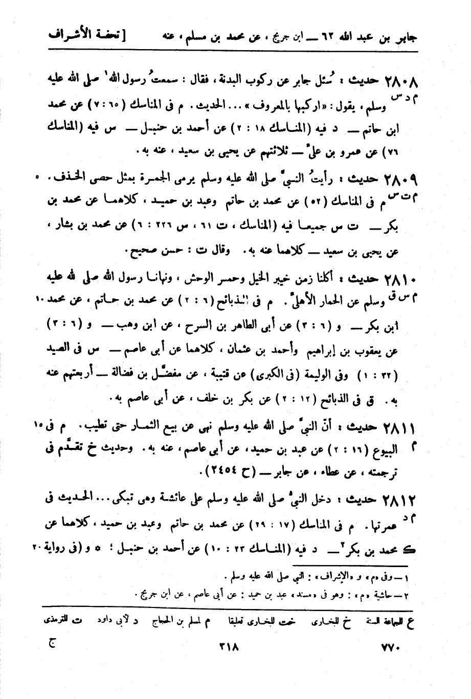 م في الذبائح (6: 2) عن محمد بن حاتم، عن محمد بن بكر - و (6: 3) عن أبي الطاهر بن السرح، عن ابن وهب - و (6: 3) عن يعقوب بن إبراهيم وأحمد بن عثمان، كلاهما عن أبي عاصم -