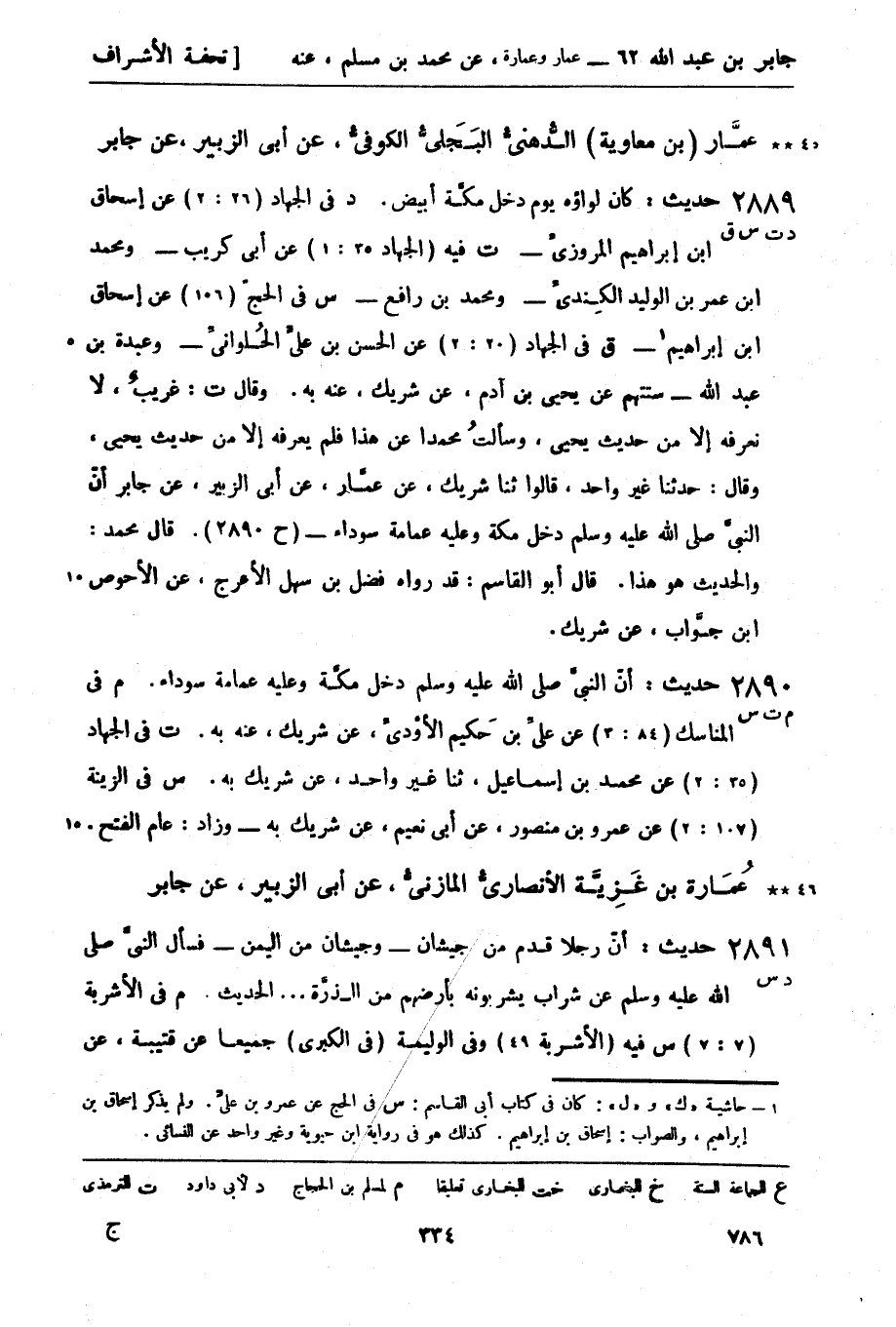 ت: غريبٌ، لا نعرفه إلا من حديث يحيى، وسألتُ محمداً عن هذا فلم يعرفه إلا من حديث يحيى، وقال: حدثنا غير واحد، قالوا ثنا شريك، عن عمار، عن أبي الزبير، عن جابر أنّ النبيَّ صَلَّى اللَّهُ عَلَيْهِ وَسَلَّمَ دخل مكة وعليه عمامة سوداء - (ح2890) . قال محمد: والحديث هو هذا. قال أبو القاسم: قد رواه فضل بن سهل الأعرج، عن الأحوص بن جوَّاب، عن شريك.
