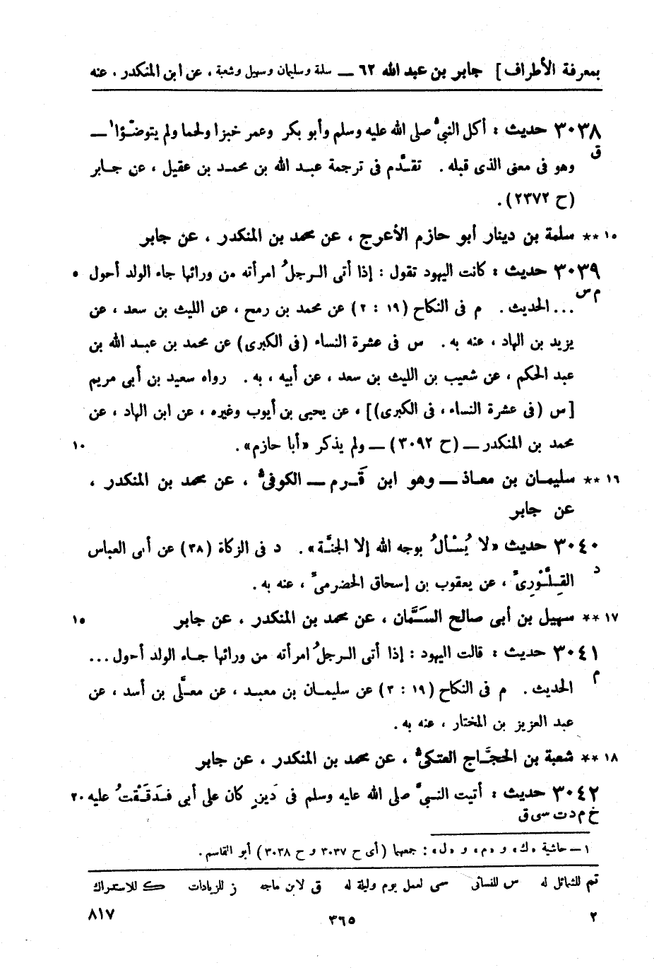 م فيه (الاستئذان 8: 1) عن محمد بن عبد الله بن نُمير، عن عبد الله بن إدريس - و (8: 2) عن يحيى بن يحيى وأبي بكر بن أبي شيبة، كلاهما عن وكيع - و (8: 3) عن إسحاق بن إبراهيم، عن النضر بن شُميل - وأبي عامر العقَديِّ - و (8: 3) عن محمد بن المثنَّى، عن وهب بن جرير - و (8: 3) عن عبد الرحمن بن بِشر بن الحكم، عن بهز بن أسد -