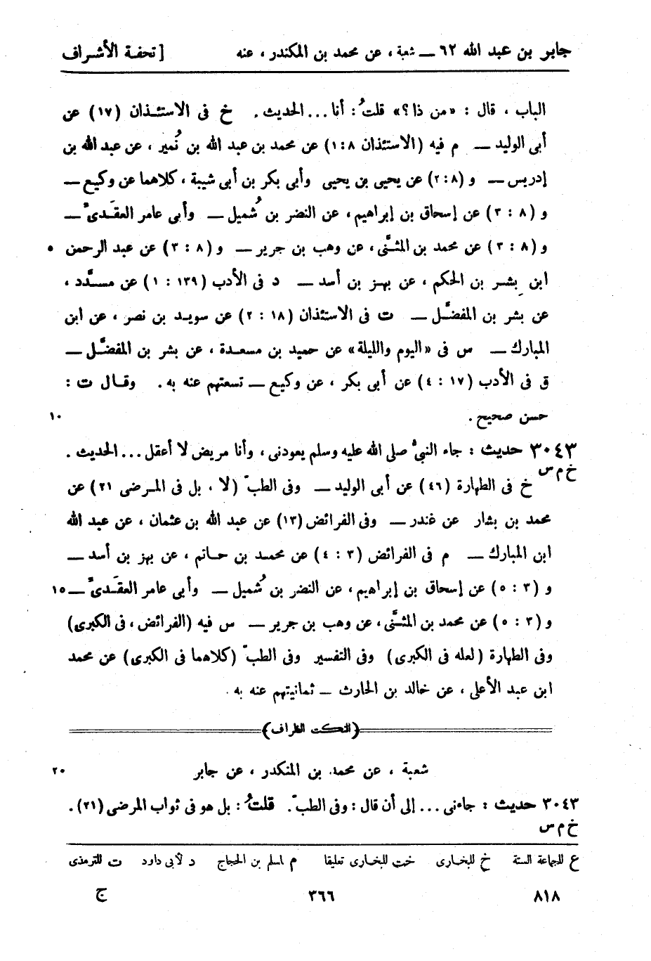خ في الطهارة (46) عن أبي الوليد - وفي الطبّ (لا، بل في المرضى 21) عن محمد بن بشار، عن غندر - وفي الفرائض (13) عن عبد الله بن عثمان، عن عبد الله بن المبارك - (م في الفرائض (3: 4) عن محمد بن حاتم، عن بهز بن أسد - و (3: 5) عن إسحاق بن إبراهيم، عن النضر بن شُميل - وأبي عامر العقَديِّ - و (3: 5) عن محمد بن المثنَّى، عن وهب بن جرير -