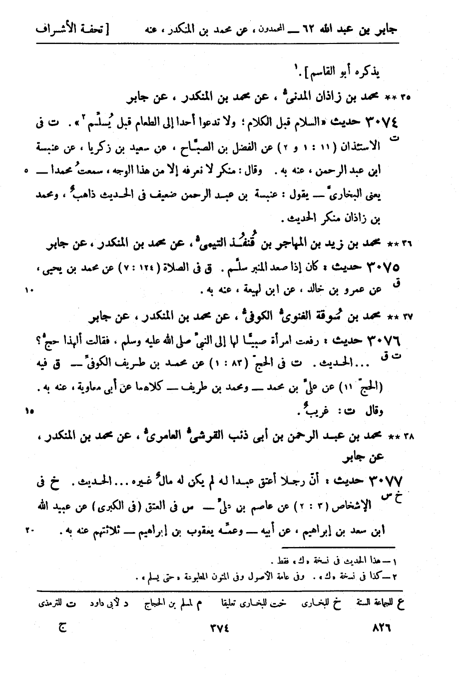 ت في الاستئذان (11: 1 و2) عن الفضل بن الصبَّاح، عن سعيد بن زكريا، عن عنبسة بن عبد الرحمن، عنه به. وقال: منكر لا نعرفه إلا من هذا الوجه، سمعتُ محمداً - يعني البخاريَّ - يقول: عنبسة بن عبد الرحمن ضعيف في الحديث ذاهبٌ. ومحمد بن زاذان منكر الحديث.