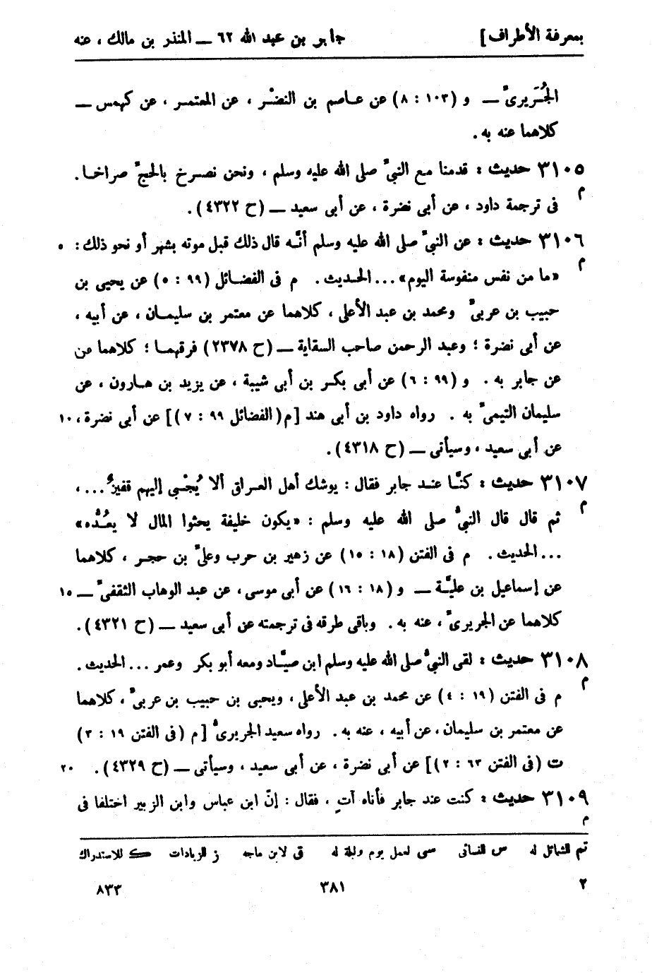 3107 -[م] حديث: كنَّا عند جابر فقال: يوشك أهل العراق ألا يجبى إليهم قفيزٌ ... ثم قال النبيّ صَلَّى اللَّهُ عَلَيْهِ وَسَلَّمَ: يكون خليفة يحثوا المال لا يعُدُّه ... الحديث.