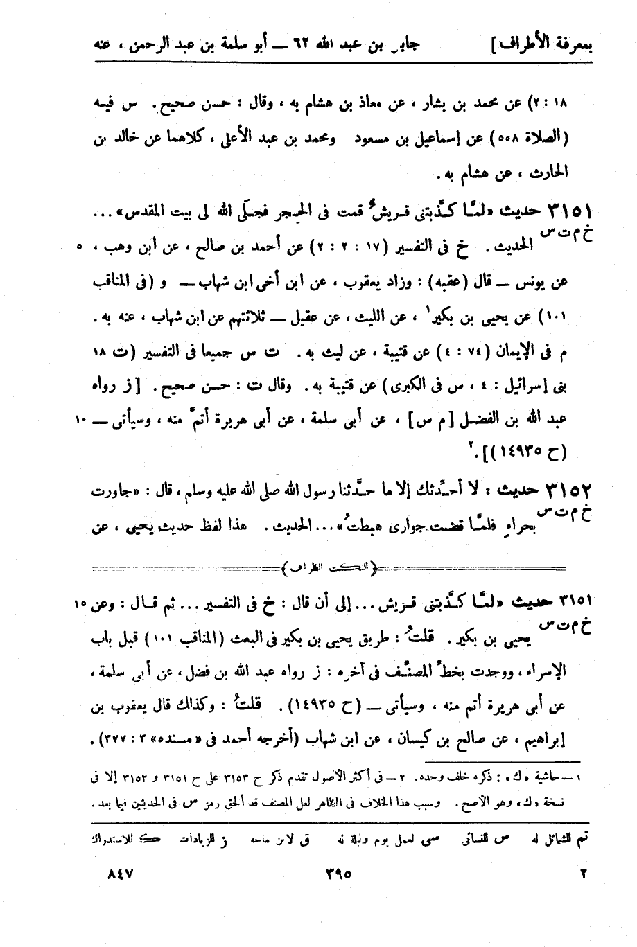 3152 -[خ م ت س] حديث: لا أحدِّثك إلا ما حدَّثنا رسول الله صَلَّى اللَّهُ عَلَيْهِ وَسَلَّمَ، قال: جاورت بحراءٍ فلمَّا قضيت جواري هبطتُ ... الحديث. هذا لفظ حديث يحيى، عن -[396]- أبي سلمة - وفيه قصَّة. وفي حديث الزهريِّ، عن أبي سلمة، عن جابر، قال: سمعت النبيَّ صَلَّى اللَّهُ عَلَيْهِ وَسَلَّمَ يحدِّث عن فترة الوحي ... الحديث نحوه.