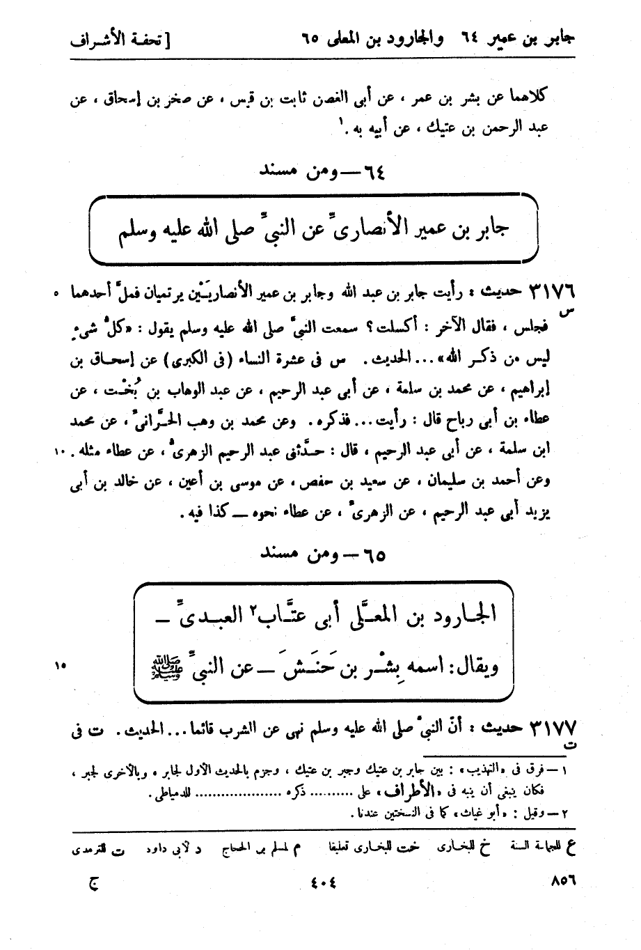ت في -[405]- الأشربة (11: 3) عن حميد بن مسعدة، عن خالد بن الحارث، عن سعيد، عن قتادة، عن أبي مسلم الجذميِّ، عن الجارود به، وقال: حسن غريب. وهكذا روى غير واحد عن سعيد، عن قتادة. وروى عن قتادة، عن يزيد بن عبد الله بن الشخِّير، عن أبي مسلم، عن الجارود أنّ النبيَّ صَلَّى اللَّهُ عَلَيْهِ وَسَلَّمَ قال: ضالَّة المسلم حرق النار - (3178) .