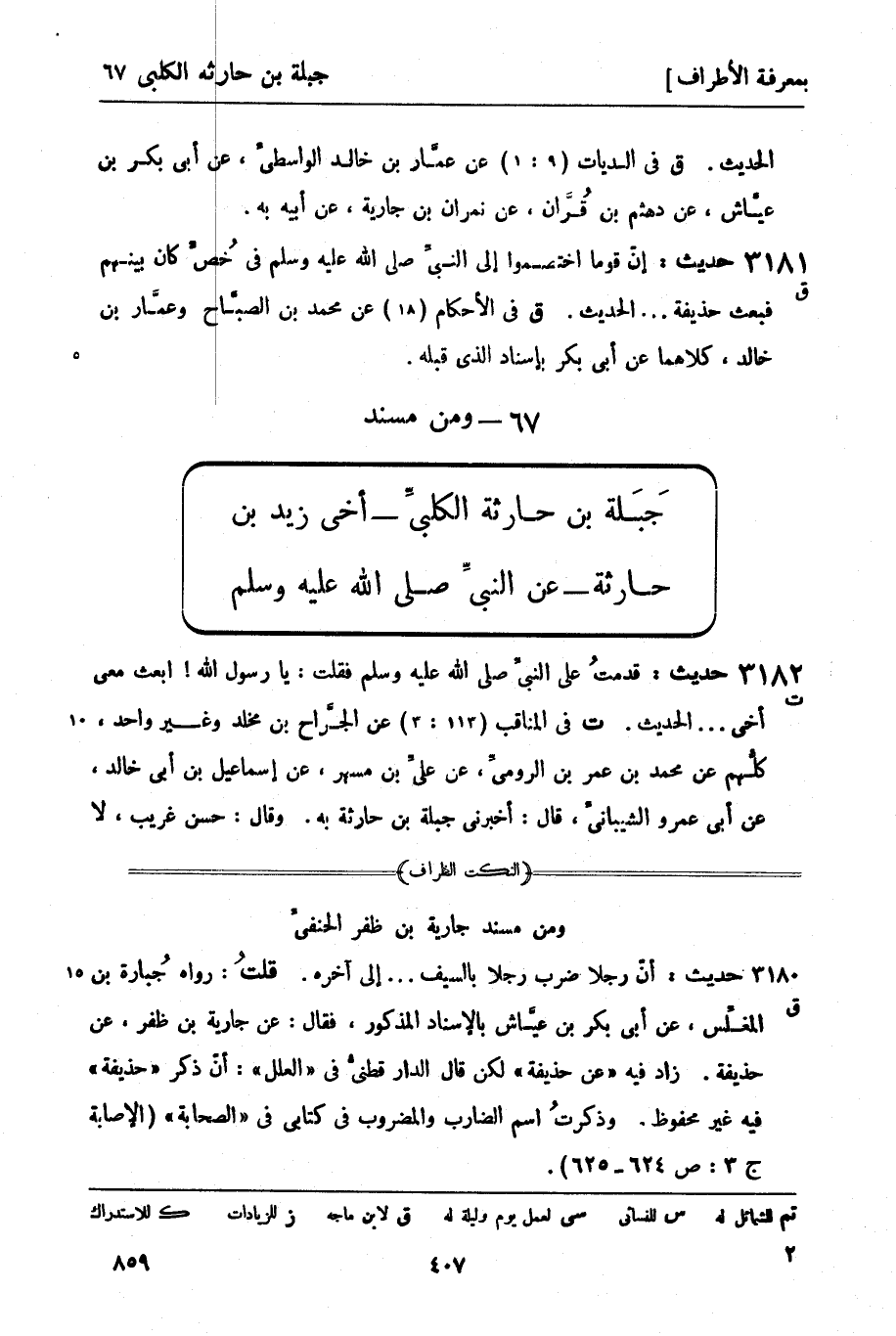 ت في المناقب (113: 3) عن الجرَّاح بن مخلد وغير واحد كلُّهم عن محمد بن عمر بن الروميِّ، عن عليِّ بن مسهر، عن إسماعيل بن أبي خالد، عن أبي عمرو الشيبانيِّ، قال: أخبرني جبلة بن حارثة به. وقال: حسن غريب، لا -[408]- نعرف إلا من حديث الروميِّ، عن عليِّ بن مسهر.