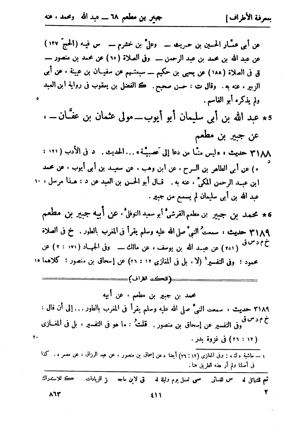 3189 -[خ م د س ق] حديث: سمعتُ النبيَّ صَلَّى اللَّهُ عَلَيْهِ وَسَلَّمَ يقرأ في المغرب بالطور.