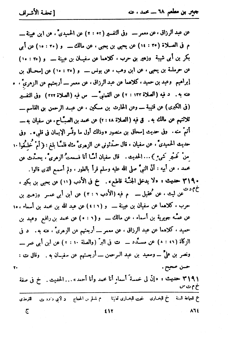 م في فضائل النبيِّ صَلَّى اللَّهُ عَلَيْهِ وَسَلَّمَ (الفضائل 34: 1) عن زهير بن حرب وإسحاق بن إبراهيم وابن أبي عمر، ثلاثتهم عن سفيان بن عيينة - و (34: 2) عن حرملة بن يحيى، عن ابن وهب، عن يونس - و (34: 3) عن عبد الملك بن شعيب بن الليث بن سعد، عن أبيه، عن جدِّه، عن عُقيل - و (34: 3) ، عن عبد بن حُميد، عن عبد الرزاق، عن معمر - و (34: 3) عن عبد الله بن عبد الرحمن الدارميِّ، عن أبي اليمان، عن شعيب - ستتهم عن الزهريِّ، عنه به..