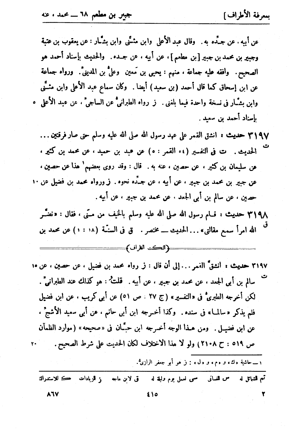 ت في التفسير (54 القمر: 5) عن عبد بن حميد، عن محمد بن كثير، عن سليمان بن كثير، عن حصين، عنه به.. قال: وقد روى بعضهم 1 هذا، عن حصين، عن جبير بن محمد بن جبير، عن أبيه، عن جدِّه نحوه. (ز) رواه محمد بن فضيل، عن حصين، عن سالم بن أبي الجعد، عن محمد بن جبير، عن أبيه.