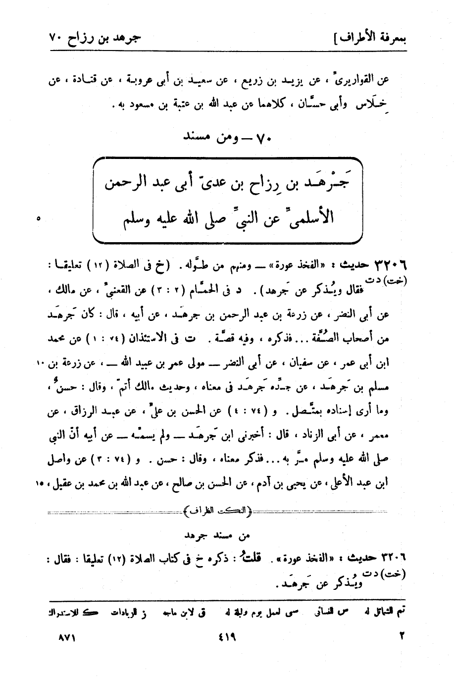 ت في الاستئذان (74: 1) عن محمد بن أبي عمر، عن سفيان، عن أبي النضر - مولى عمر بن عبيد الله -، عن زرعة بن مسلم بن جَرهَد، عن جدِّه جَرهَد في معناه، وحديث مالك أتمّ، وقال: حسنٌ وما أرى إسناده بمتَّصل. و (74: 4) عن الحسن بن عليَ، عن عبد الرزاق، عن معمر، عن أبي الزناد، قال: أخبرني ابن جَرهَد - ولم يسمِّه - عن أبيه أنّ النبي صَلَّى اللَّهُ عَلَيْهِ وَسَلَّمَ مرَّ به ... فذكر معناه. وقال: حسن. و (74: 3) عن واصل بن عبد الأعلى، عن يحيى بن آدم، عن الحسن بن صالح، عن عبد الله بن محمد بن عقيل، -[420]- عن عبد الله بن جَرهَد الأسلميِّ، عن أبيه، عن النبيِّ صَلَّى اللَّهُ عَلَيْهِ وَسَلَّمَ قال: الفخذ عورة - مختصر، وقال: حسنٌ غريبٌ من هذا الوجه. رواه عبد الله بن نافع الصائغ، عن مالك، عن أبي النضر، عن زرعة بن عبد الرحمن بن جَرهَد، عن أبيه، عن جدِّه. ورواه معن وإسحاق بن الطبَّاع وابن وهب وابن أبي أويس، عن مالك، عن أبي النضر، عن زرعة بن عبد الرحمن، عن أبيه، عن النبيِّ صَلَّى اللَّهُ عَلَيْهِ وَسَلَّمَ ولم يذكر جدَّه. ورواه قبيصة، عن سفيان الثوريِّ، عن أبي الزناد، عن زرعة بن عبد الرحمن، عن جدِّه جَرهَد - ولم يذكر أباه. ورواه غير ابن أبي عمر، عن ابن عيينة، عن أبي النضر، عن زرعة بن مسلم بن جَرهَد، عن أبيه، عن جدِّه.