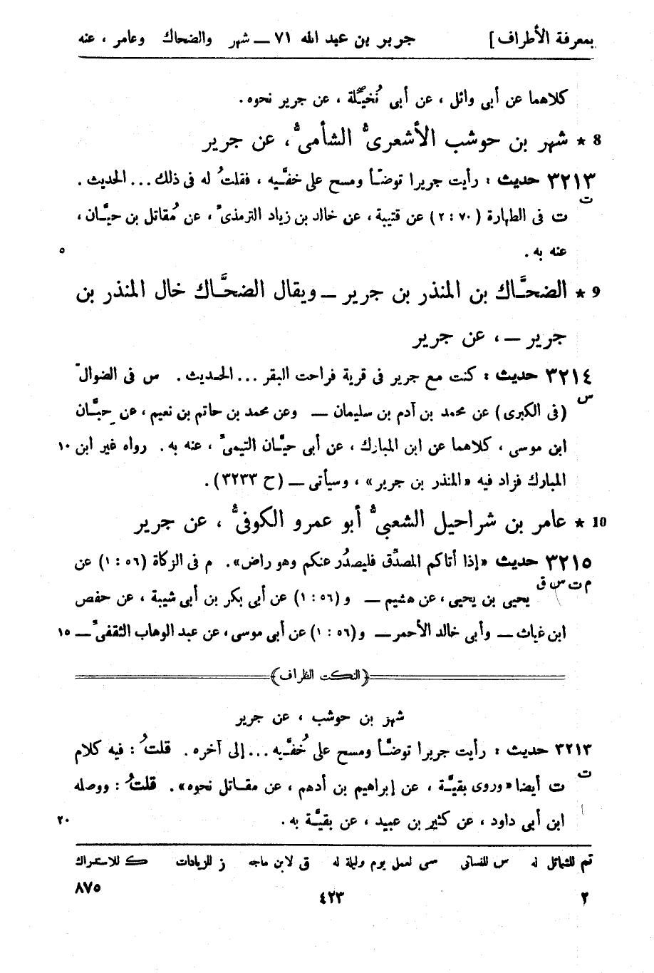 ت فيه (الزكاة 20: 2) عن أبي عمَّار الحسين بن حُريث، عن سفيان بن عيينة، عن داود به. و (20: 1) عن عليِّ بن حجر، عن محمد بن يزيد، عن مجالد، عنه به.