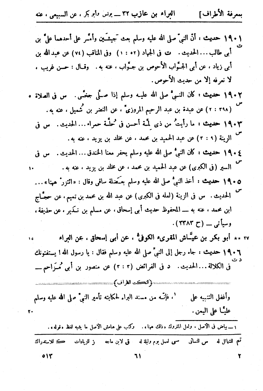 1905 -[س] حديث: أخذ النبيُّ صَلَّى اللَّهُ عَلَيْهِ وَسَلَّمَ بعَضَلة ساقي وقال: ائتزرْ ههنا ... الحديث. س في الزينة (لعله في الكبرى) عن عبد الله بن محمد بن تميم، عن حجَّاج بن محمد، عنه به - المحفوظ حديث أبي إسحاق، عن مسلم بن نَذَير، عن حذيفة وسيأتي - (ح 3383) .