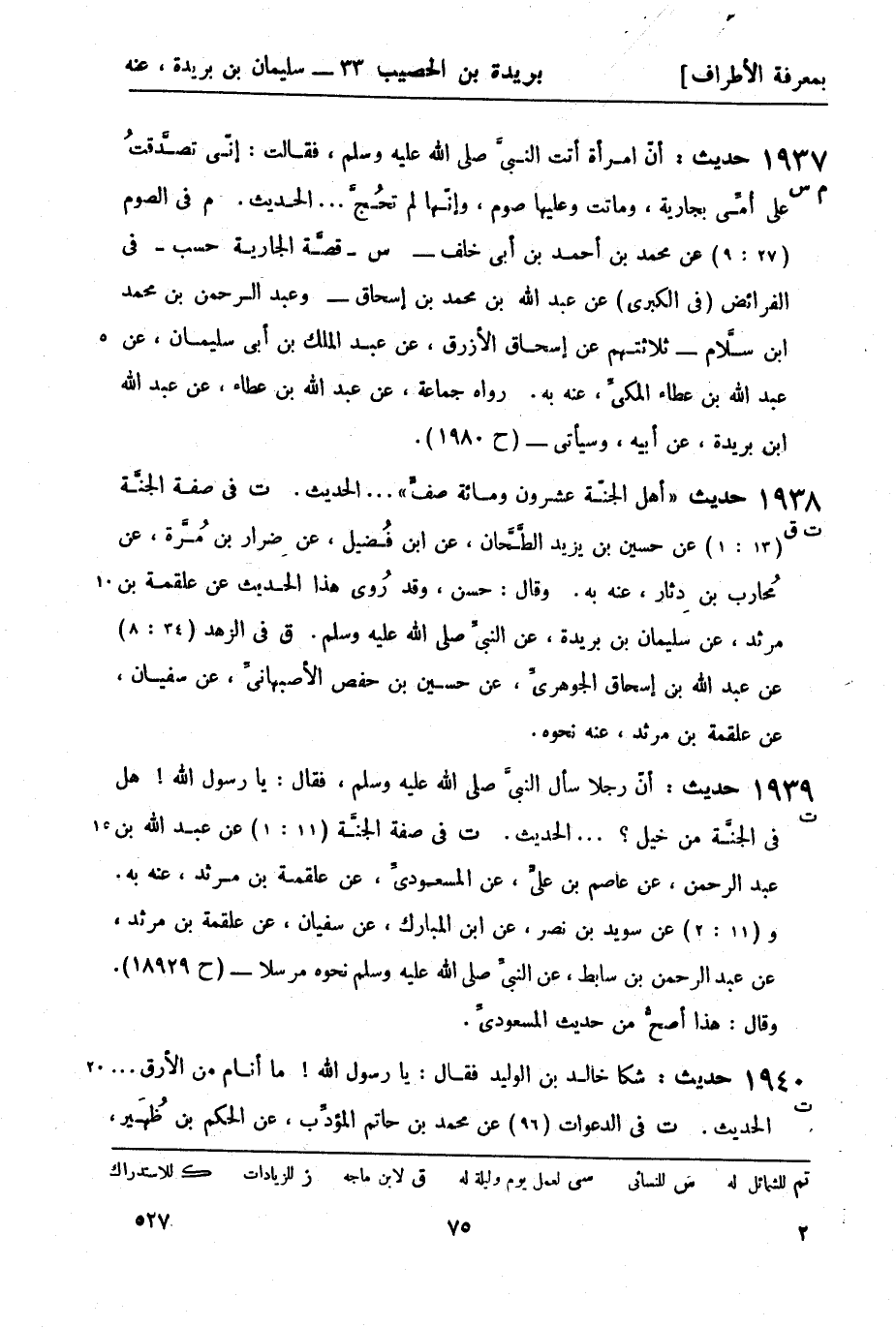 1937 -[م س] حديث: أن امرأة أتت النبي صَلَّى اللَّهُ عَلَيْهِ وَسَلَّمَ فقالت: إني تصدقت على أمي بجارية، وماتت وعليها صوم، وإنها لم تحج ... الحديث. م في الصوم (27: 9) عن محمد بن أحمد بن أبي خلف - س - قصة الجارية حسب - في الفرائض (في الكبرى) عن عبد الله بن محمد بن إسحاق - وعبد الرحمن بن محمد بن سلام - ثلاثتهم عن إسحاق الأزرق، عن عبد الملك بن أبي سليمان، عن عبد الله بن عطاء المكي، عنه به. رواه جماعة، عن عبد الله بن عطاء، عن عبد الله بن بريدة، عن أبيه، وسيأتي - (ح1980) .