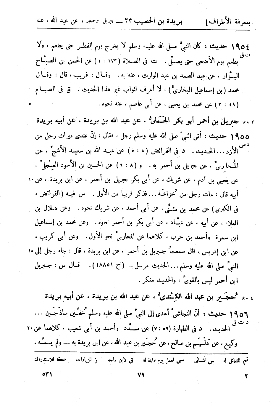 1954 -[ت ق] حديث: كان النبي صَلَّى اللَّهُ عَلَيْهِ وَسَلَّمَ لا يخرج يوم الفطر حتى يطعم، ولا يطعم يوم الأضحى حتى يصلي. ت في الصلاة (273: 1) عن الحسن بن الصباح البزار، عن عبد الصمد بن عبد الوارث، عنه به. وقال: غريب، قال: وقال محمد (بن إسماعيل البخاري) : لا أعرف لثواب غير هذا الحديث. ق في الصيام (49: 3) ، عن محمد بن يحيى، عن أبي عاصم، عنه نحوه.