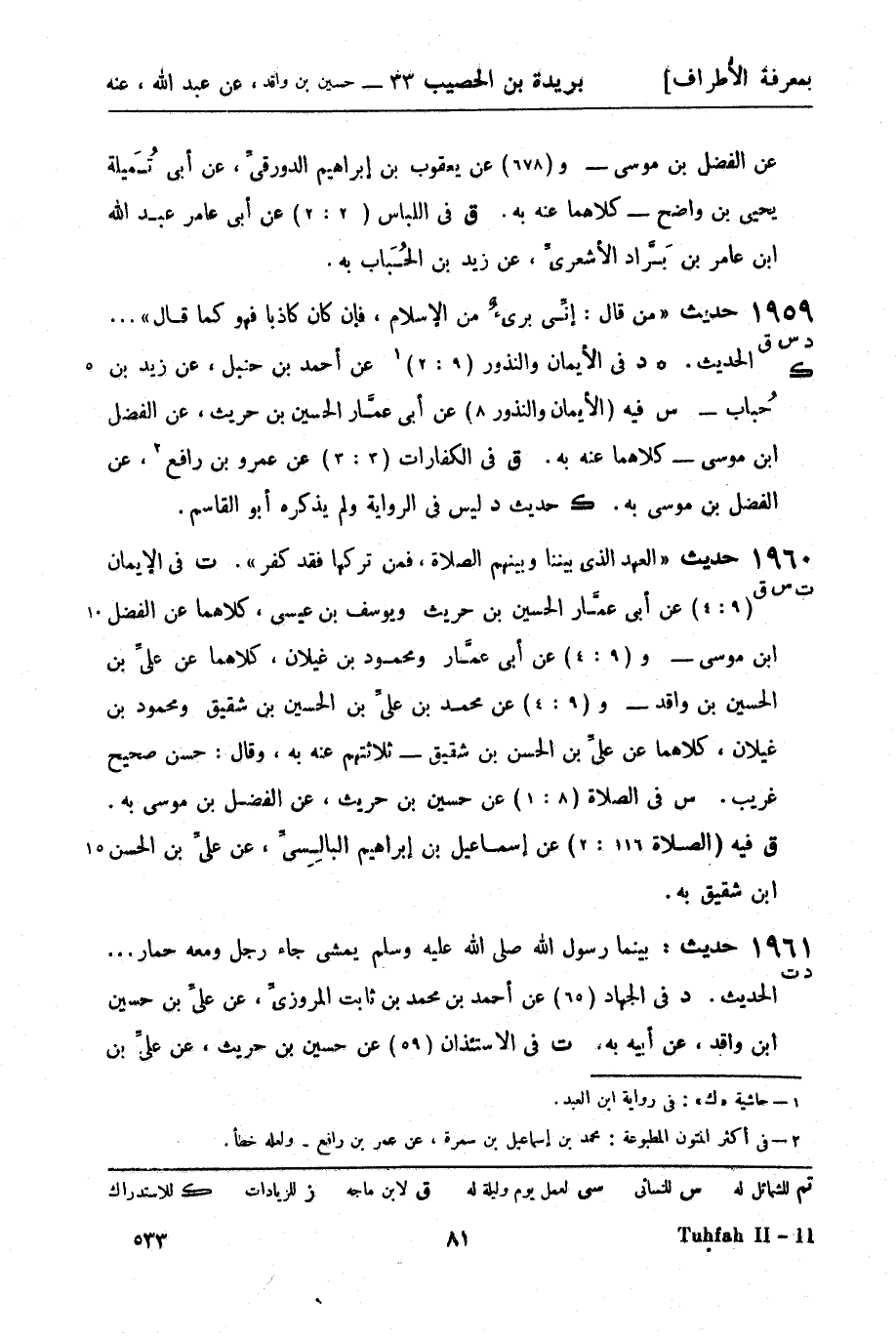 1960 -[ت س ق] حديث العهد الذي بيننا وبينهم الصلاة، فمن تركها فقد كفر. ت في الإيمان (9: 4) عن أبي عمار الحسين بن حريث ويوسف بن عيسى، كلاهما عن الفضل بن موسى - و (9: 4) عن أبي عمار ومحمود بن غيلان، كلاهما عن علي بن الحسين بن واقد - و (9: 4) عن محمد بن علي بن الحسين بن شقيق ومحمود بن غيلان، كلاهما عن علي بن الحسن بن شقيق - ثلاثتهم عنه به. وقال: حسن صحيح غريب. س في الصلاة (8: 1) عن حسين بن حريث، عن الفضل بن موسى به، ق فيه (الصلاة 116: 2) عن إسماعيل بن إبراهيم البالسي، عن علي بن الحسن بن شقيق به.