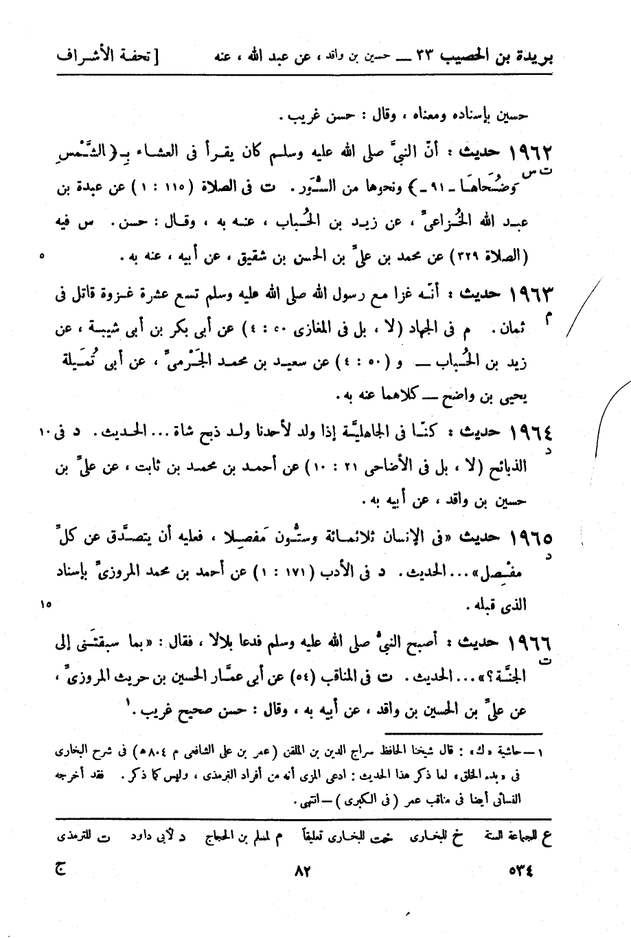 1966 -[ت] حديث: أصبح النبي صَلَّى اللَّهُ عَلَيْهِ وَسَلَّمَ فدعا بلالا، فقال: بما سبقتني إلى الجنة؟ ... الحديث. ت في المناقب (54) عن أبي عمار الحسين بن حريث المروزي، عن علي بن الحسين بن واقد، عن أبيه به، وقال: حسن صحيح غريب 1