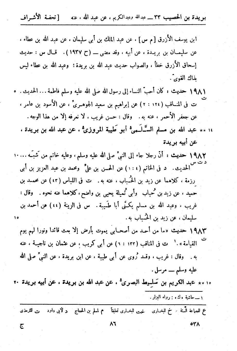 1983 -[ت] حديث ما من أحد من أصحابي يموت بأرض إلا بعث قائدا ونورا لهم يوم القيامة 1. ت في المناقب (133: 6) عن أبي كريب، عن عثمان بن ناجية، عنه به. وقال: غريب، وقد روى، عن أبي طيبة، عن ابن بريدة، عن النبي صَلَّى اللَّهُ عَلَيْهِ وَسَلَّمَ - مرسل.